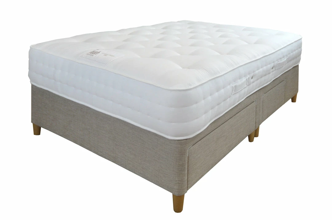 The exceptional Hush Naturals 2000 Divan Set is brought to you by Airsprung Beds. With wool cotton and silk fillings placed on top of 2000 pocket springs this model will not disappoint. Traditional tufting is added on this one to keep the luxurious fillings in place, with air vents to add ventilation. The base comes with wooden leg’s and is covered in a beige fabric. Why not add some draws a range of options are available.Â