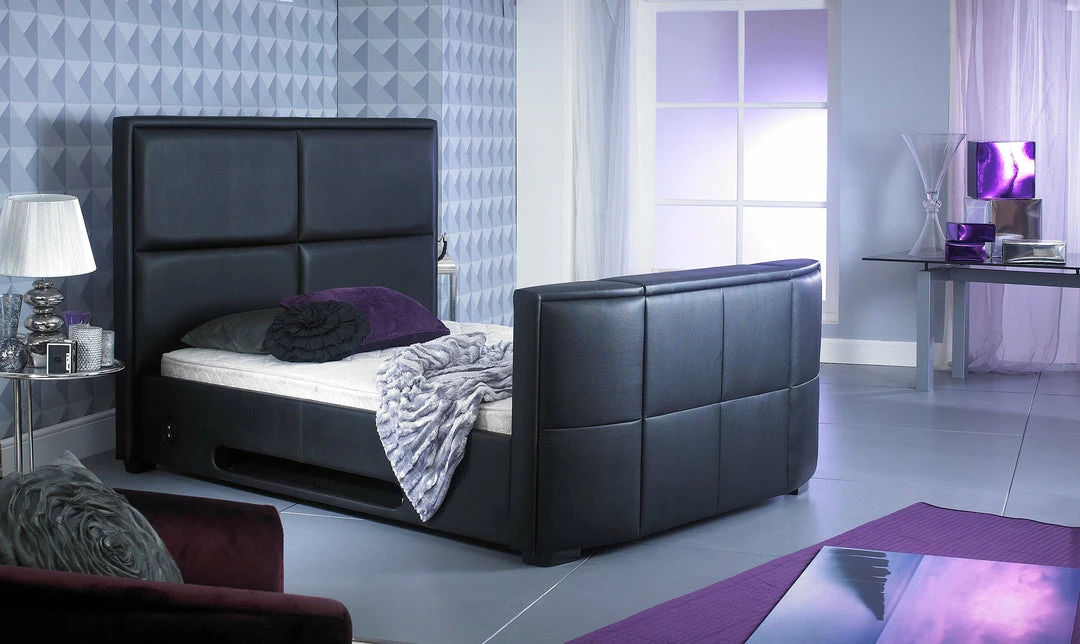 Below the base is a compartment for all your DVD’s and television accessories allowing you to access with ease. There’s a switch on the side to move the TV up or down just open the top of the footboard and turn the button. It’s a match for stylish home this leather TV bed brings the entertainment to the bedroom. Â