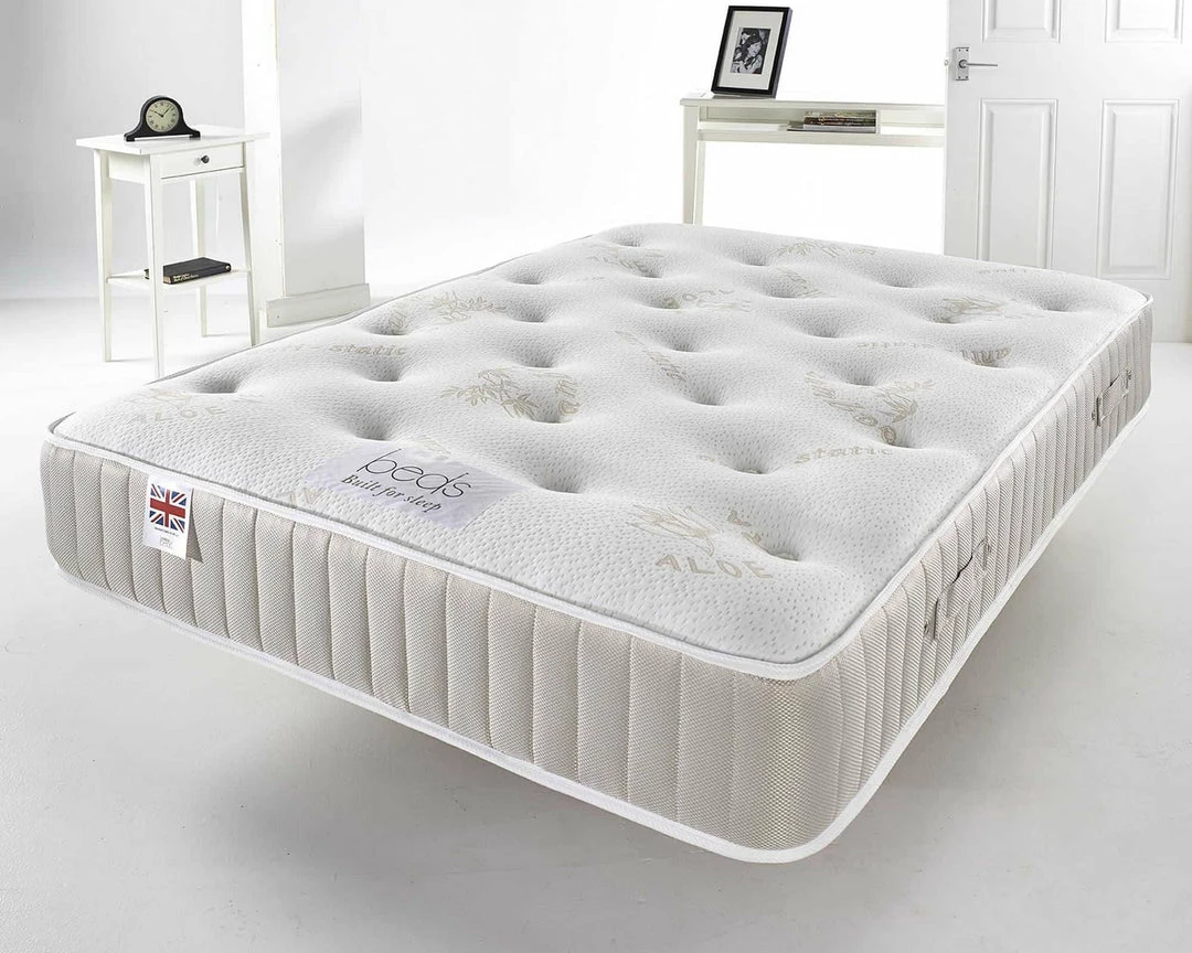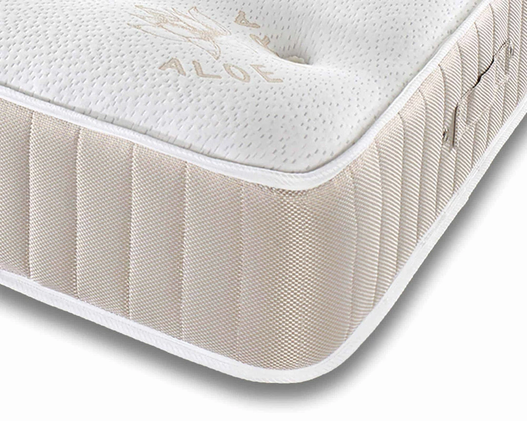 With 1000 pocket springs for support accompanied by fiber fillings for comfort. This mattress would be the ideal choice if your looking for a healthy sleeping experience. The Aloe Vera fabric cover is added to help with your skin giving a regenerative effect. Hand made with tufting added keeping the fillings in place and adding support for the end user.  Â