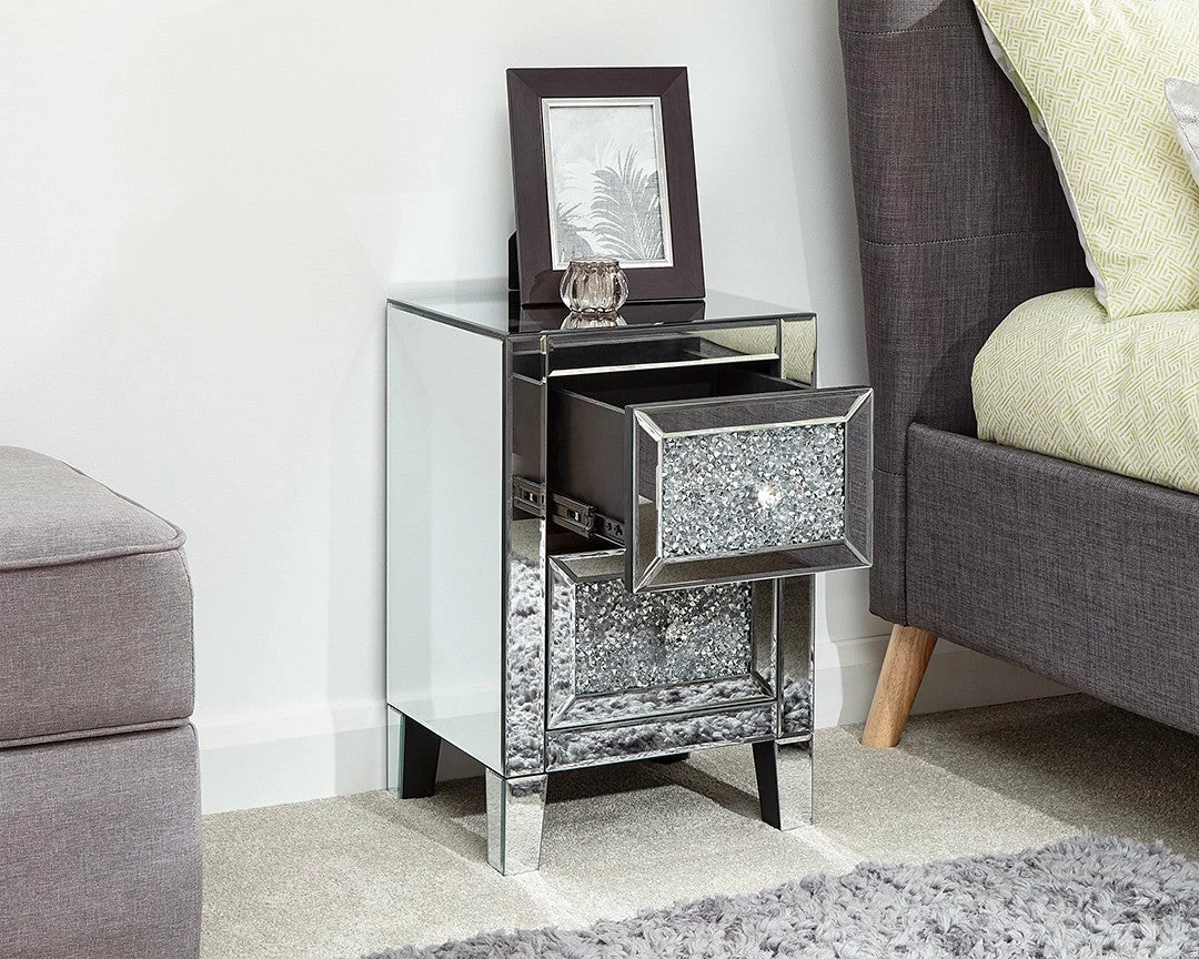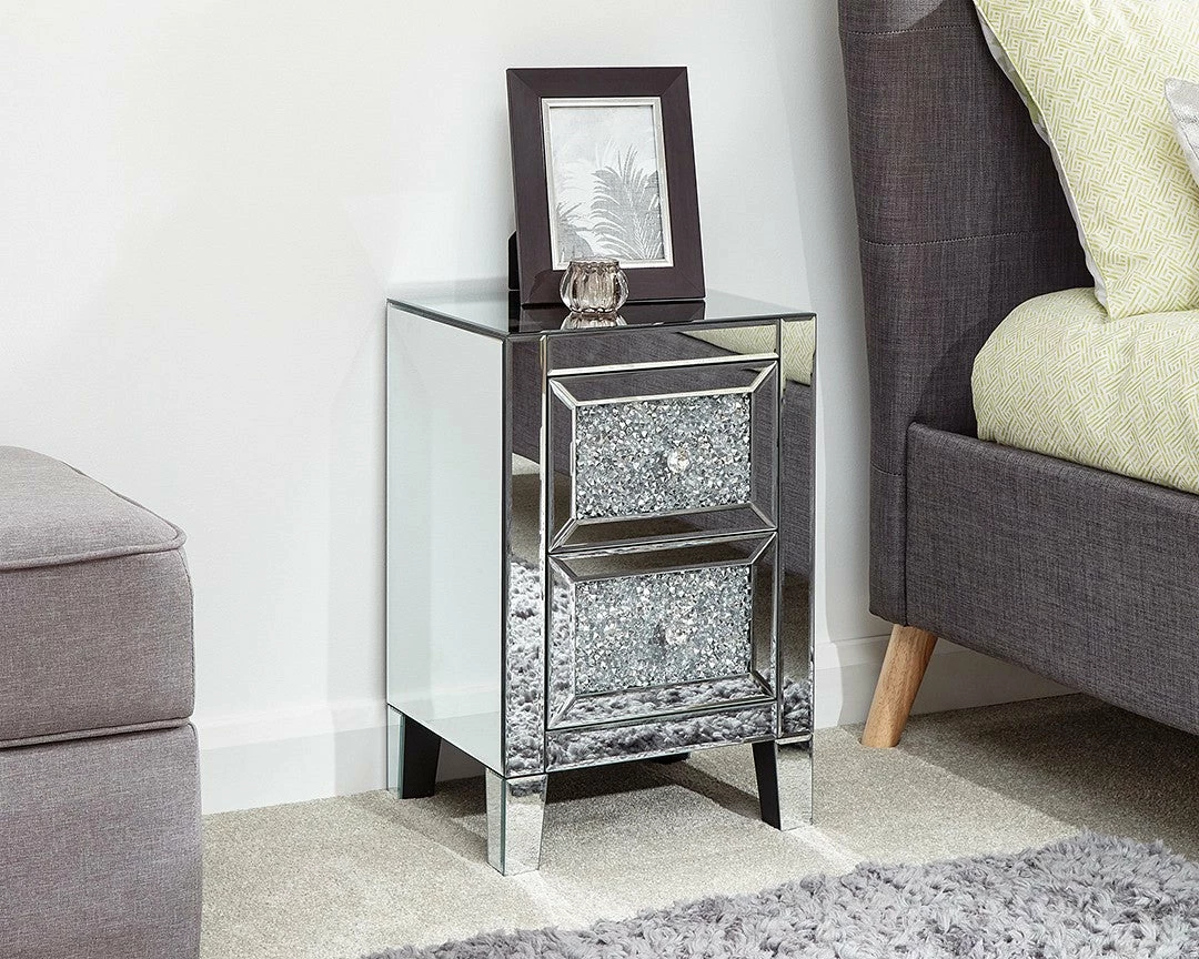 Stunning and dazzling this glass bed side table with 2 draws has all the makings of a glamorous edition in the bedroom. The strong MDF wood and glass combination is going to be reliable through out the years. The sturdy design helps accessing the charming bedside table from your bedsteads.Â