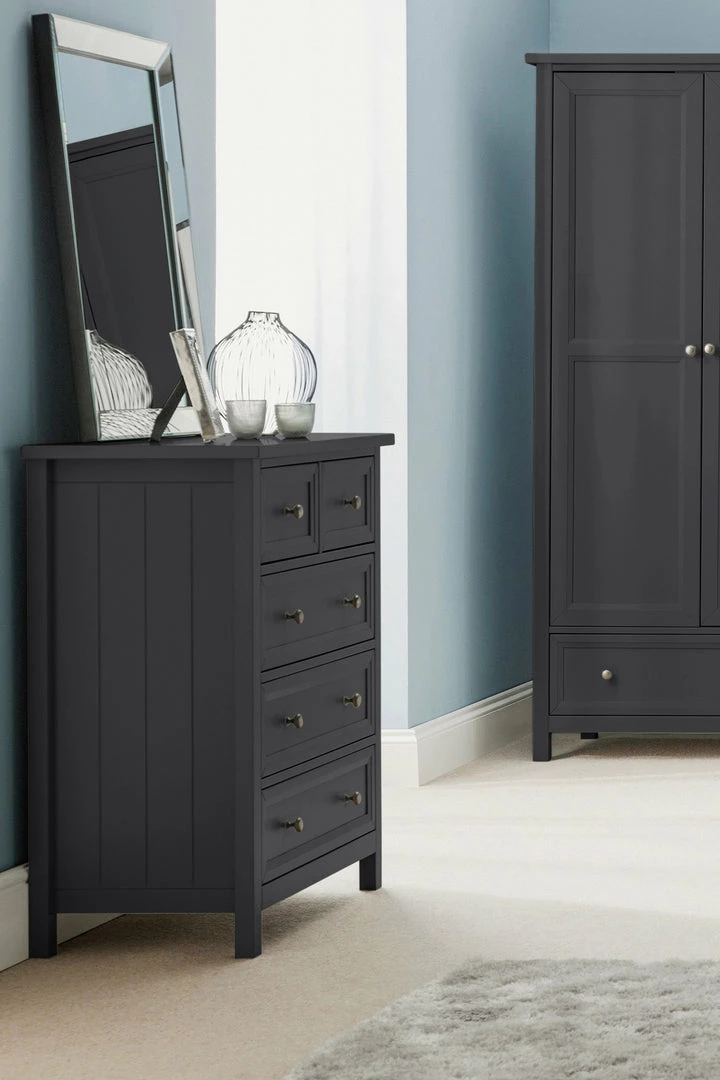 The unique Anthracite and New England style work together for a charming effect ideal for modern bedrooms. With the chamfered edges and side panelling this chests charming bringing character to the room of choice. Use the handles to access the drawers easily, they also look the part for stylish combination.Â
