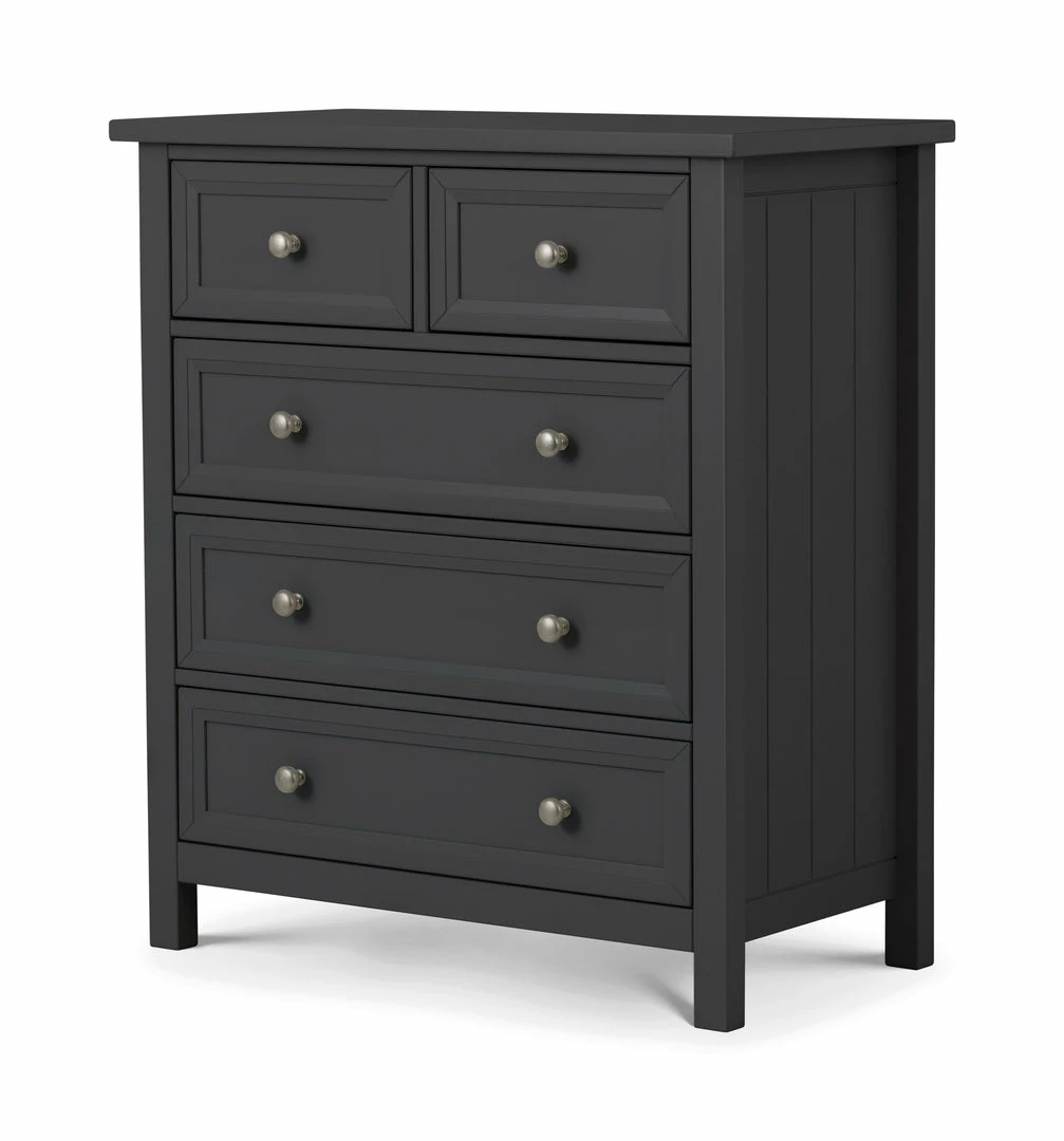 The Julian Bowen Maine Anthracite 3 + 2 chest has everything for a stylish bedroom designed for storage. With the robust solid pine wood this chest for the long term. The Lacquer finish is presentable and effortless to maintain just dust and wipe down when needed. The space inside could be used for multiple products like clothing and bedroom products providing easy access in the space.Â