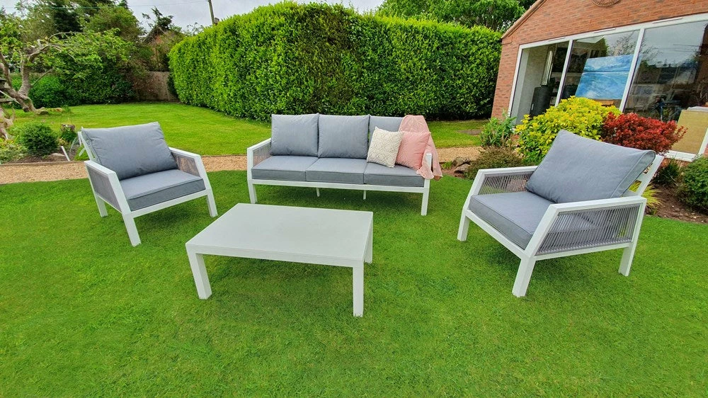 Charming and sophisticated this metal and fabric sofa set would be the go too place in the garden this summer. In a grey and white colour which is ideal for matching with other furniture. The arm rests have a detailed design which makes this garden furniture set unique.Â