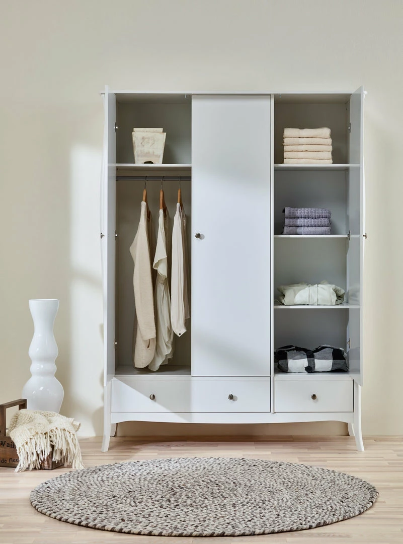 Baroque White 3 Door Wardrobe is an ideal solution for anyone looking to add class to a bedroom. The three doors and three draw model is a great storage option. If you are looking for a full bedroom furniture set then the Baroque range would be a perfect range to look at.Â