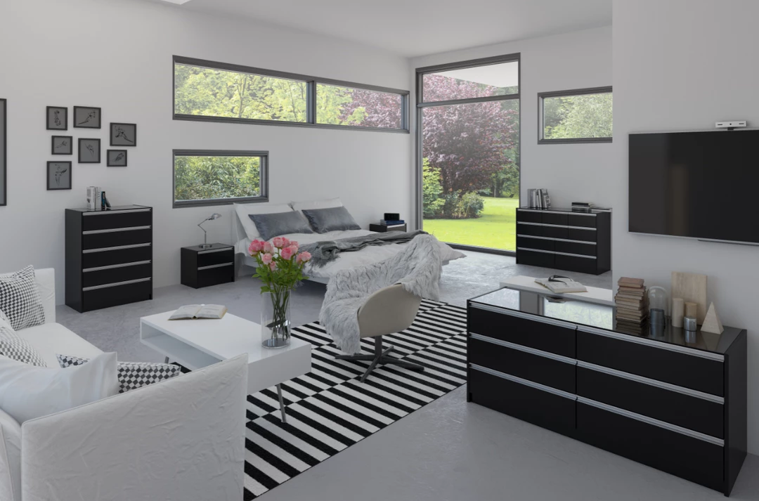 With the Steens Skyline 5 Drawer Black having a grounded design this unit will be stable while in use. The top surface could be used for multiple objects like lamps and pictures. Buy with the rest of the Steens Skyline set or alone the choice is yours. The cabinet comes flat packed on the day of deliveryÂ