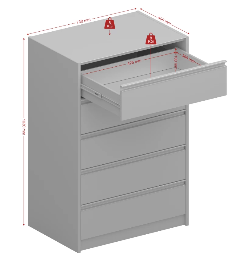Effective and simplistic this large 5 chest of drawers would make all the difference in a stylish bedroom. The modern design is going to add sophistication and with the large draws storage is a big gain. The solid MDF wood is strong and reliable this buys for the future providing long term gains.Â