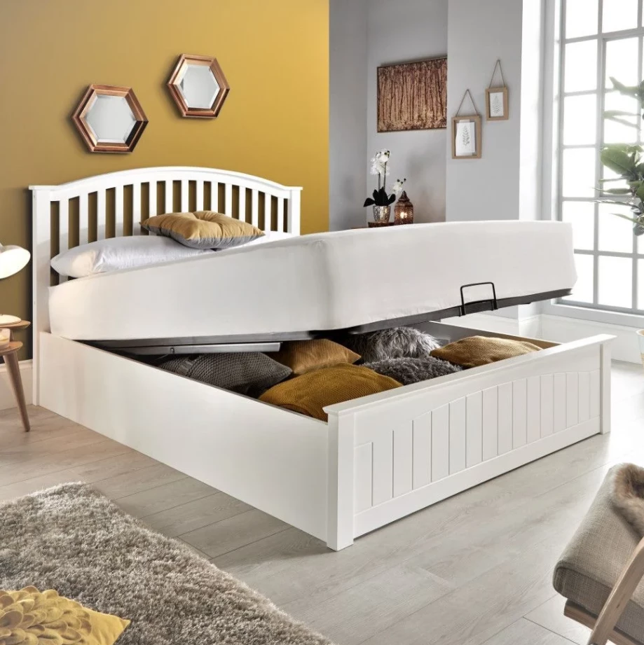 Stylish and modern this wooden ottoman bed could be just the buy you need for a family home. The design is simple but effective the slightly curved headboard adds a certain charm and character to this white ottoman bed.Â