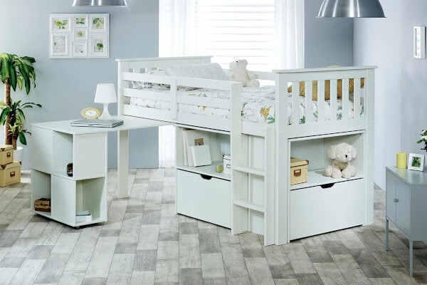 With the Bedmaster Milo Sleep Station Desk Storage Bed you get the choice of either white or grey. There both neutral colours which is great for mixing and matching with other furniture in the space. There the shelves and storage unit which could hold blankets and bedding inside and a place to add teddy bears and lamps on the top surface.