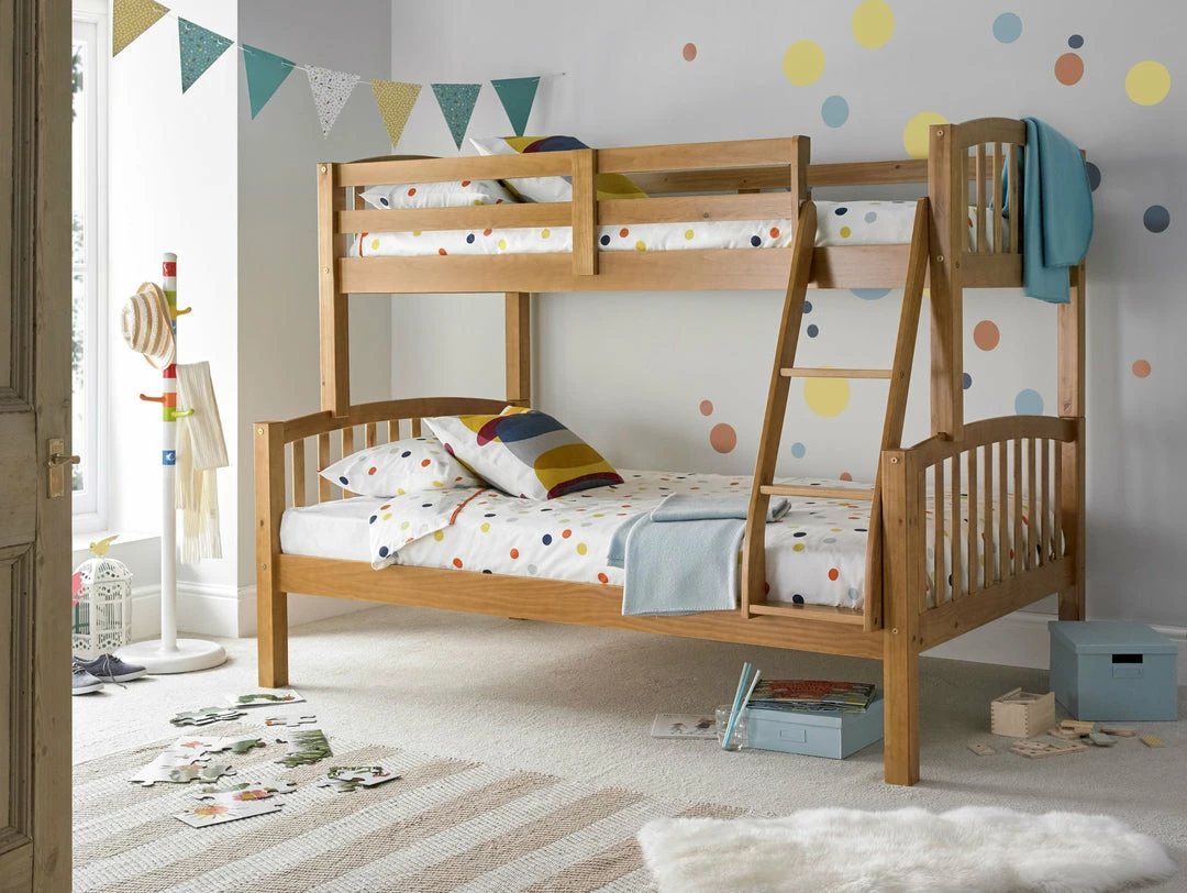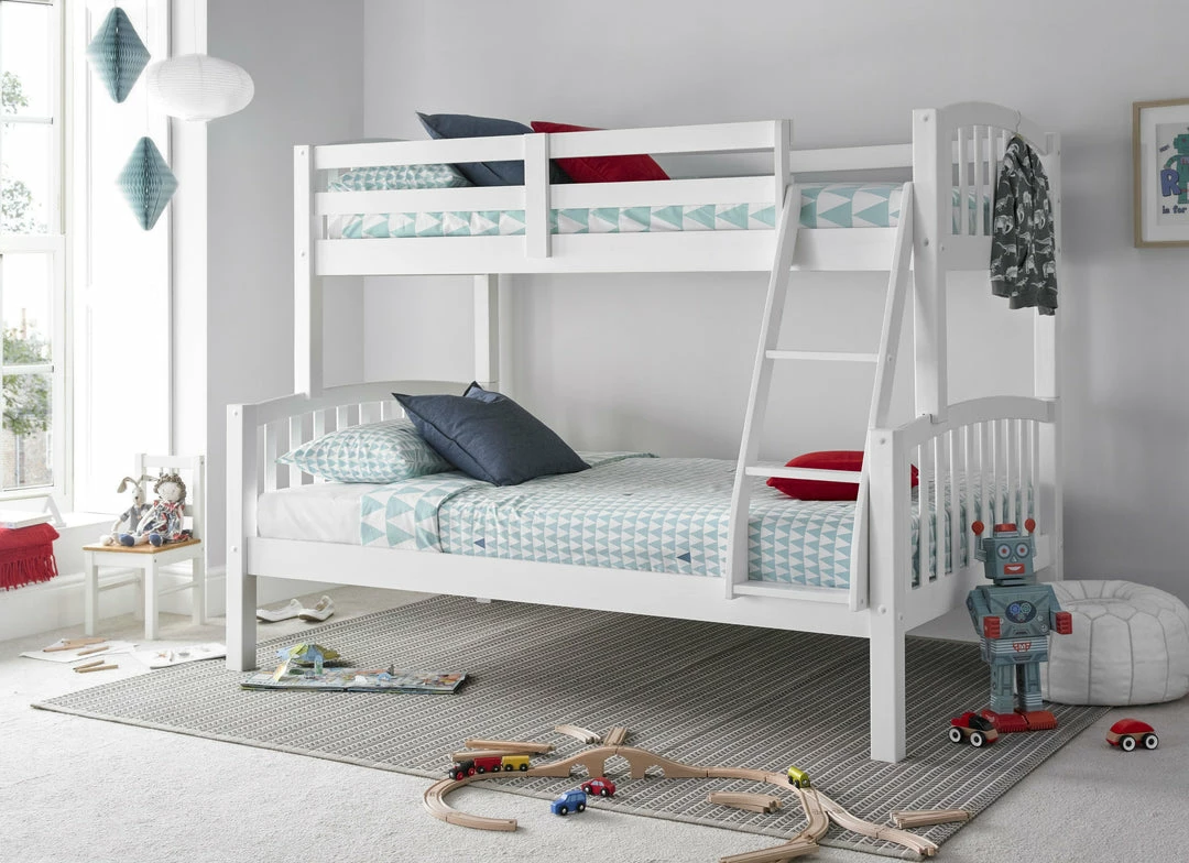 The wooden material is robust, solid and sturdy ideal for the long term. Available in a pine and white colours this beds modern and would work well with other furniture in the space. This triple sleeper has a slated base effective for ventilation the children’s mattress and providing a supportive foundation. There’s also scope for storage underneath the frame, add there boxes and toys for extra space in other places.Â