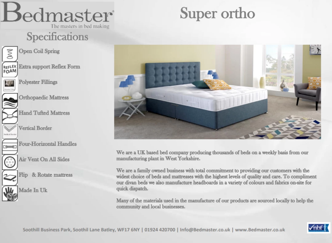 The Bedmaster Super Ortho Divan Set is going to add a healthy and stylish feature to the bedroom and home. With an orthopaedic spring system the mattress is suitable for sleepers who suffer with back aches and pains. The upholstered base comes in a large range of colour options allowing you to add your own style to the bedroom.Â