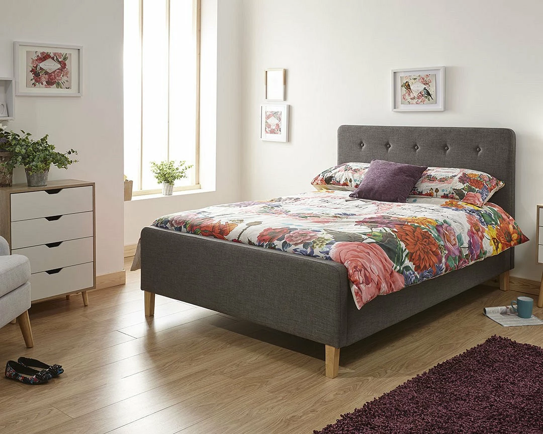 This ottoman bed comes with style and sophistication. The button headboard would make for an ideal feature in any bedroom. With the unique side opening ottoman bed bringing advantages as well your life style will be improved by this buy. The wooden feet finish this dark grey fabric bed off with elegance.Â