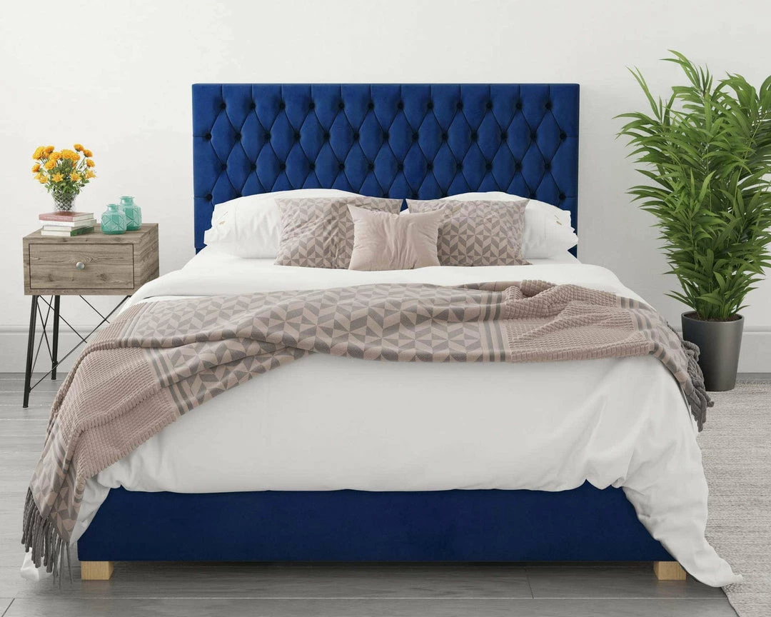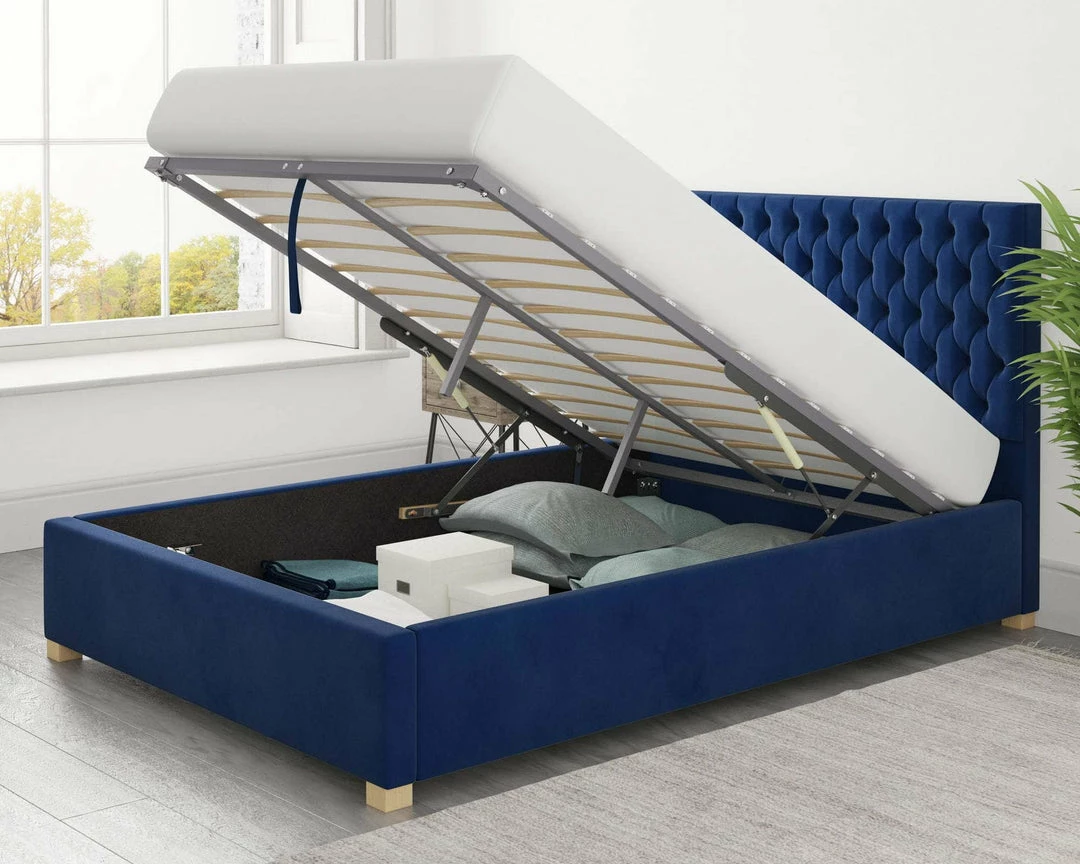 Add this blue ottoman bed to the home for a vibrant stylish storage solution. The design is elegant with the diamond and button headboard and with the low foot end ideal for tall sleepers. The padding is perfect for a back drop while you lay up watching your favourite films and movies at night and the morning.Â