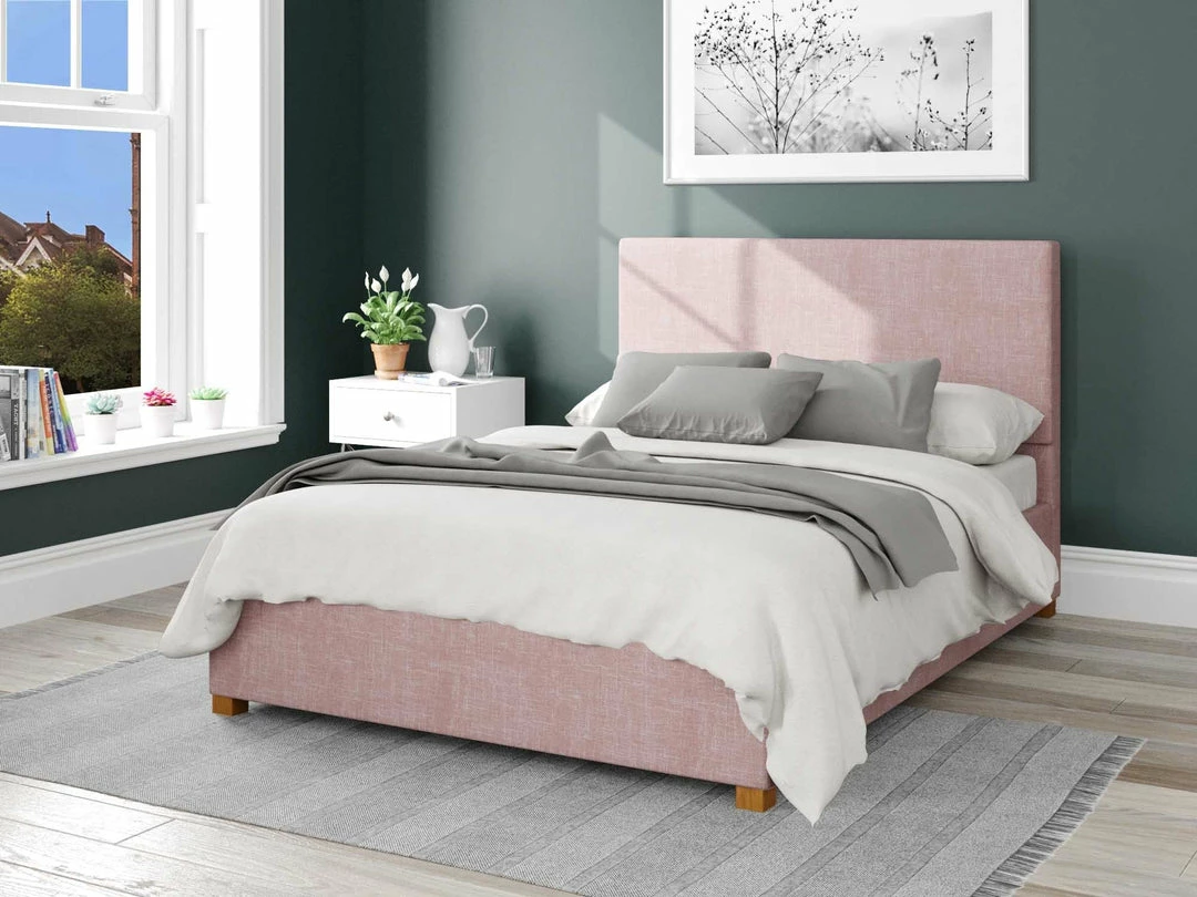 Built to last underneath the pink fabric there’s a wooden frame that’s robust and strong. The platform features a metal frame and slatted base the ideal partners for your mattresses, ventilating and supportive. Wooden legs finish the bed adding another colour and material to the bedroom. Â