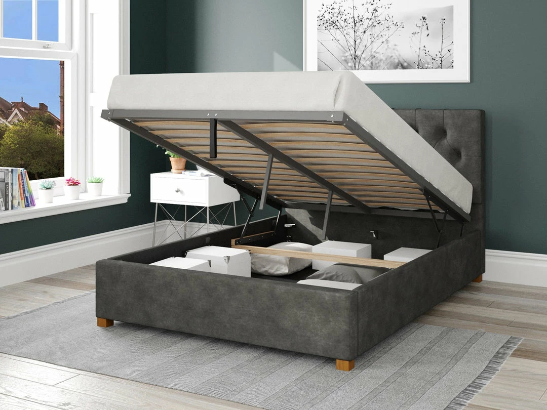 Making space is easy. The Portsmouth ottoman bed has everything you require for the bedroom. Don’t complicate the space with a button effect headboard and low foot end. The velvet upholstery for maximum comfort and sprung slatted base.Â