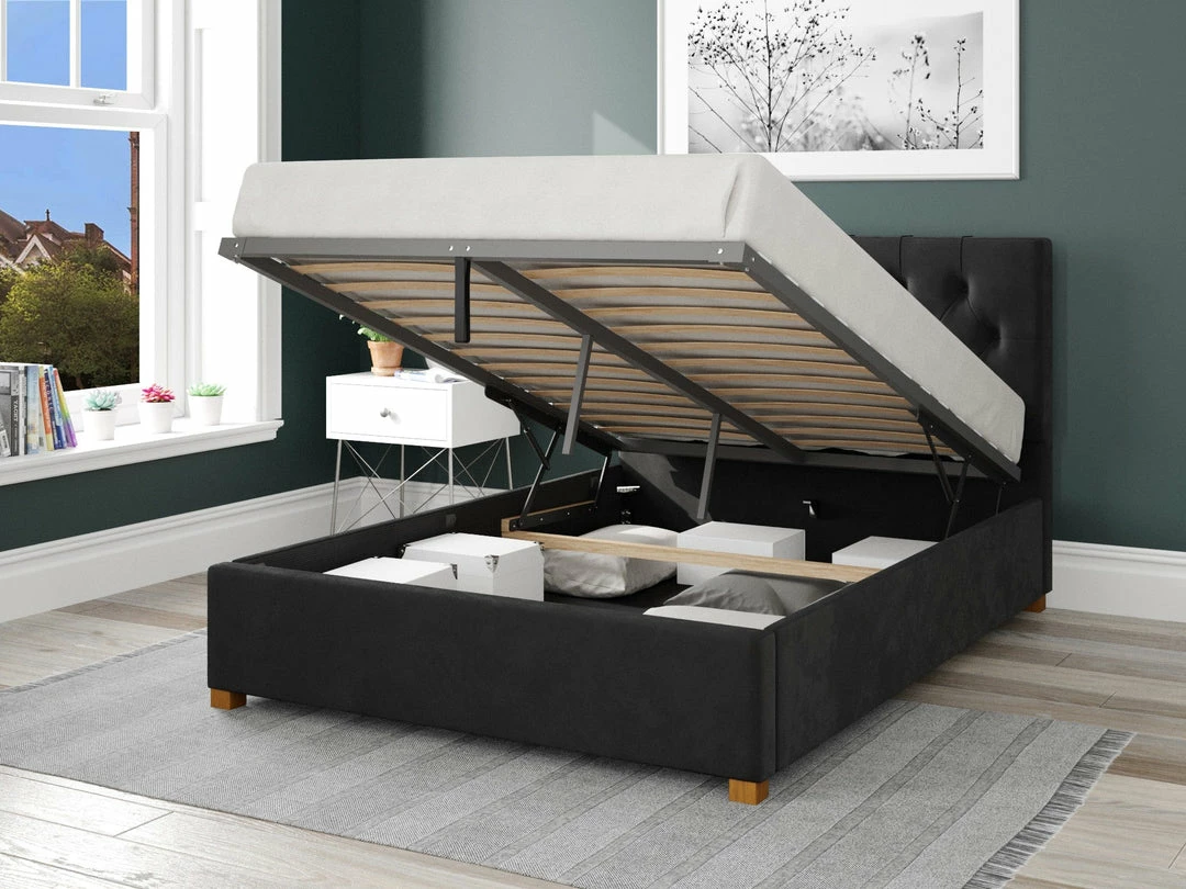 If your searching for a new ottoman bed the Portsmouth could be the one. Black velvet upholstery and button headboards make this buy modern. Lay back and relax before bedtime.Â