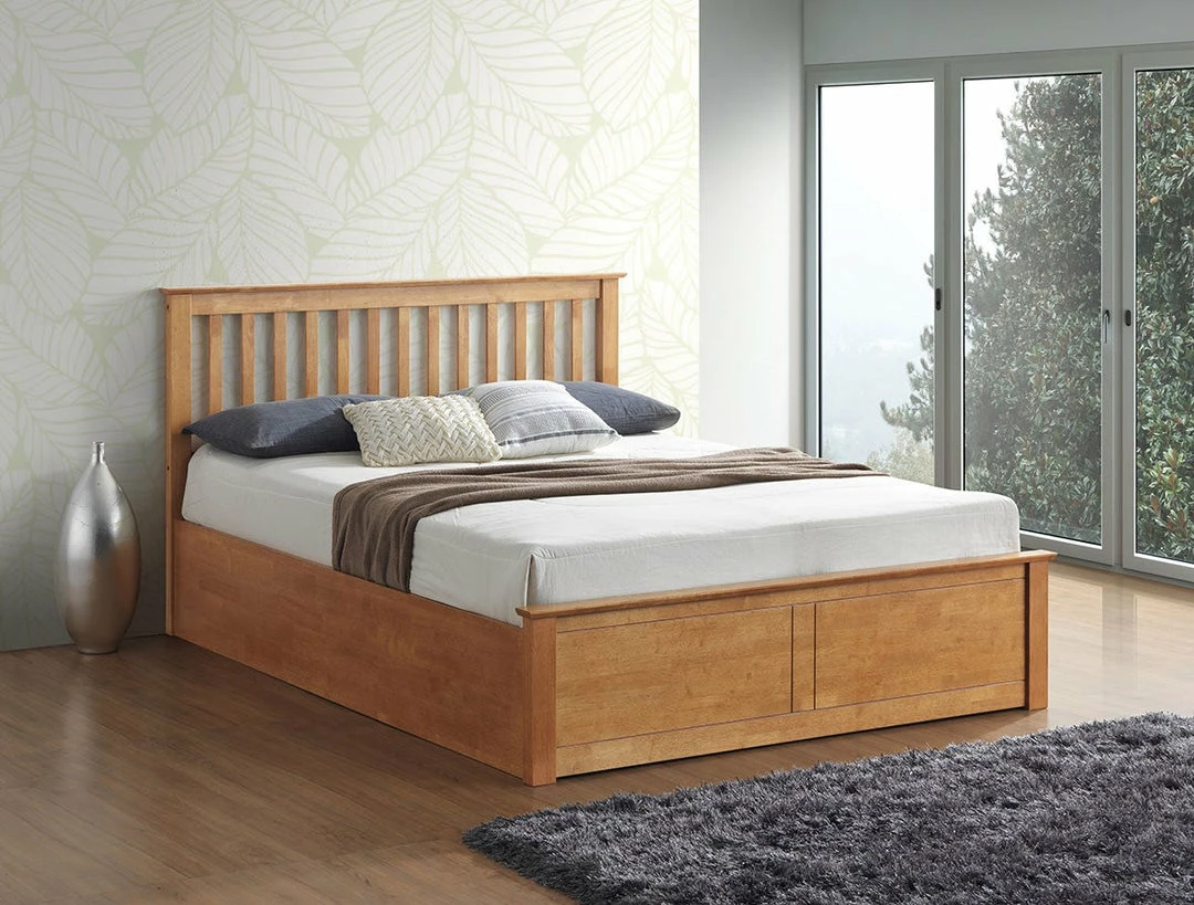 Modern and space saving ideal for family homes. The Copenhagen Ottoman Bed in an oak finish would provide a stylish storage solution in the house. With the sprung slatted base and gas piston mechanism your mattress has a quality foundation.Â