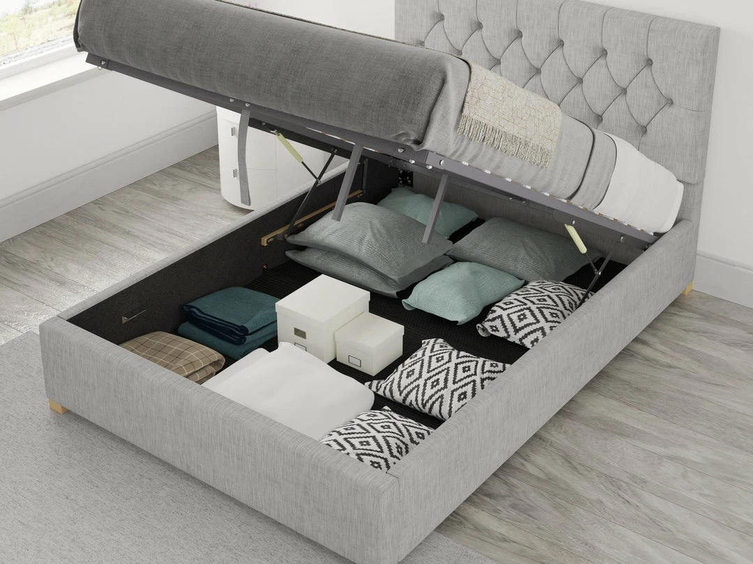 Modern and contemporary this grey ottoman beds going to have all you need for storage and style in the bedroom. There’s lot’s of padding on the diamond patterned headboard, keeping you comfortable in the morning and evening while enjoying your latest Netflix drama. The upholstery is quality and with the colour grey your bedrooms going to have a modern theme and centre piece.Â