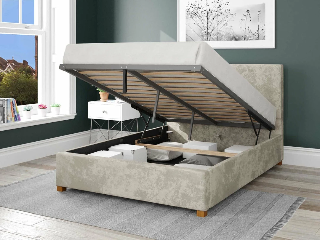 Make your bedroom stylish with the Peterborough ottoman bed. In a velvet material providing a modern effect. A simplistic headboard with straight lines keeping the space fresh.Â
