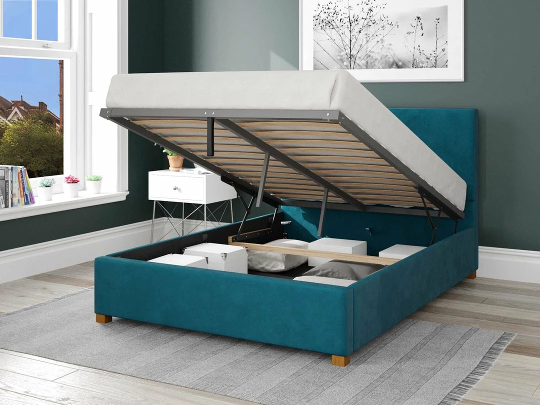 Every bedroom needs style and storage. This teal green ottoman bed brings a simplistic and stylish theme to the bedroom. The upholstery fabric brings warmth to the bedroom creating a soft and gentle to the touch with an inviting theme to the bed. Â