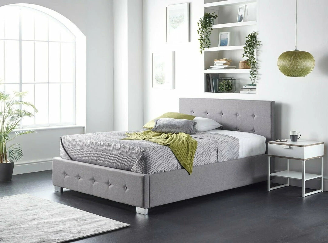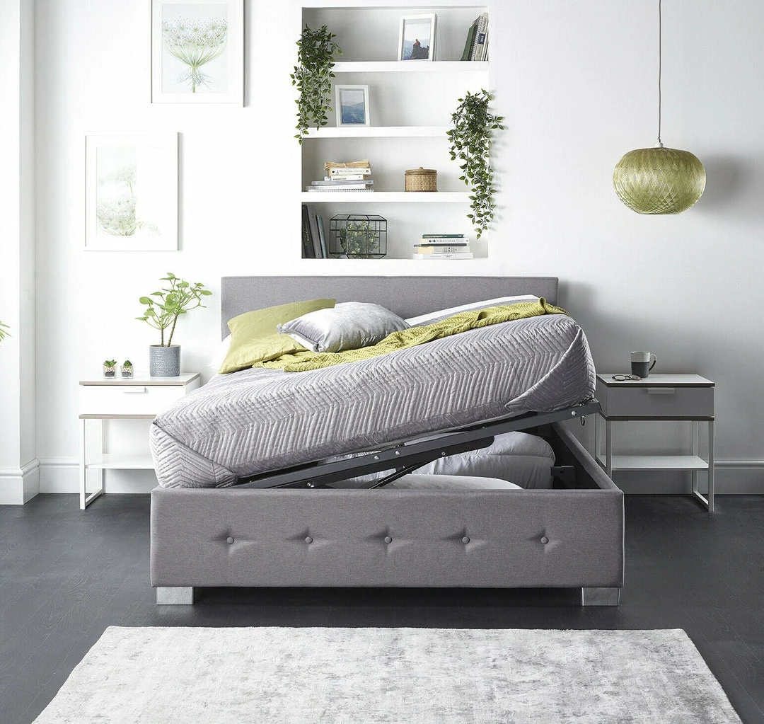 Sophisticated and trendy this grey linen side lift ottoman bed could an effective edition to a loft space or any other bedroom to be exact. The storage depth is just right with 25cm inside which is ideal for pillows and bedding creating more space in other areas of the home. The grey fabric is neutral along with the button foot and headboard modern.Â