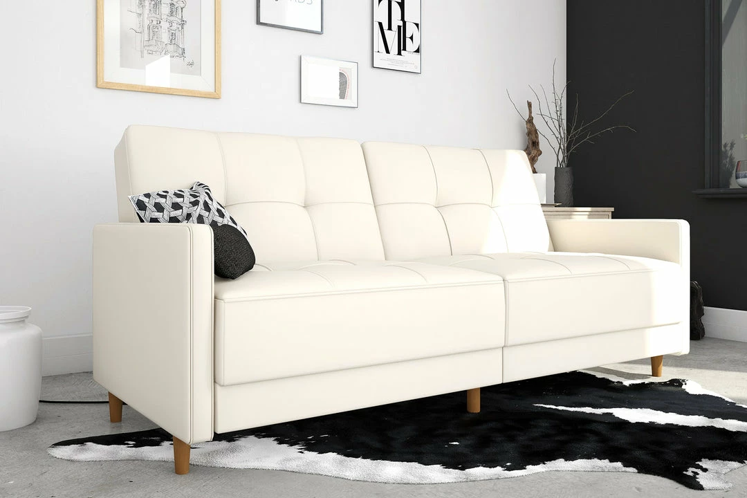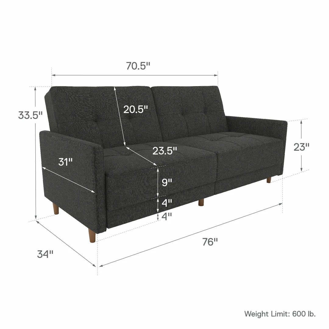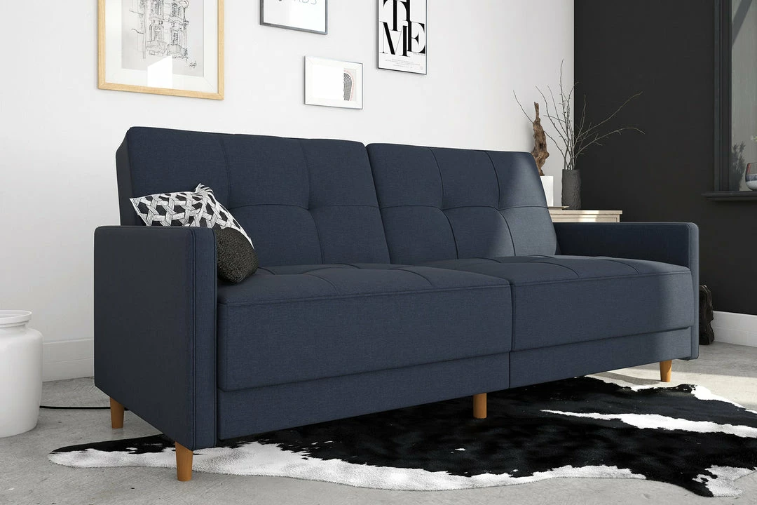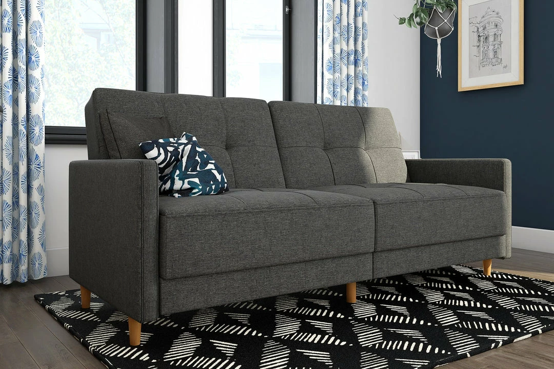 The padded cushion add support and comfort to the sleeping and sitting surface. There’s the detailed stitching and button effect, this adds a contemporary vibe to the sofa bed. Finished with wooden legs raising the sofa bed from the floor providing a stable platform for the furniture piece.  Â