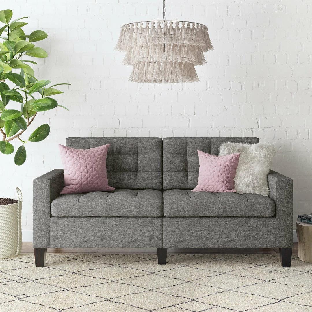 Practical and for a modern home the Dorel Home Bowie Small Space Sofa is for stylish homes only. The linen upholstery is contemporary and supplies easy maintenance to the sofas advantages. With a tailored design this brings sophistication and shows qualities from the craftsman. Â