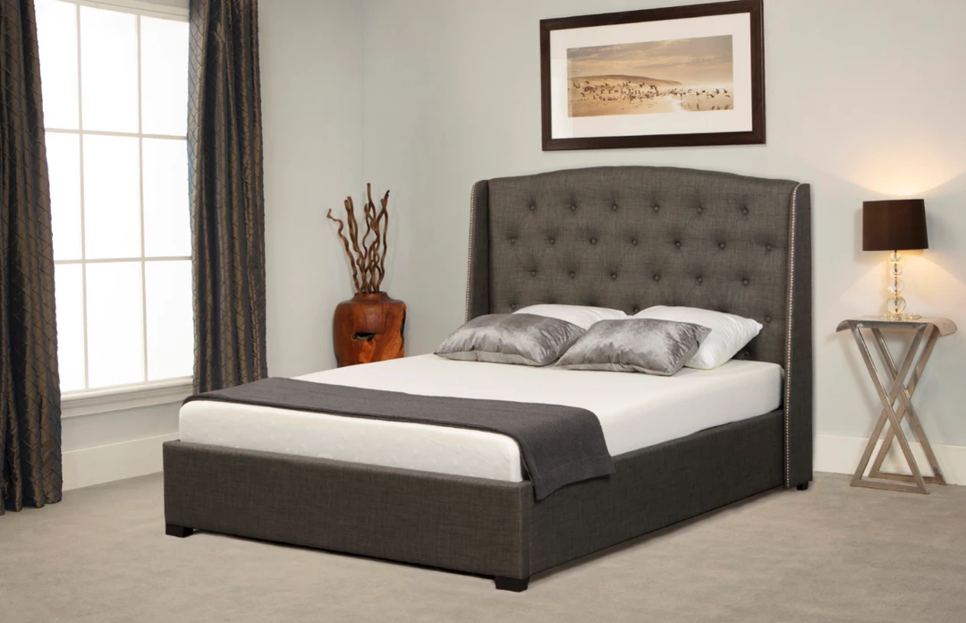 The grey fabric finish is easy to match with and makes this bed modern and stylish. The black feet bring another shade to the bedroom and slightly elevate the bed from the floor for added effect. The curve in the headboard and the slight wing add a certain character to the bed making it unique. Â