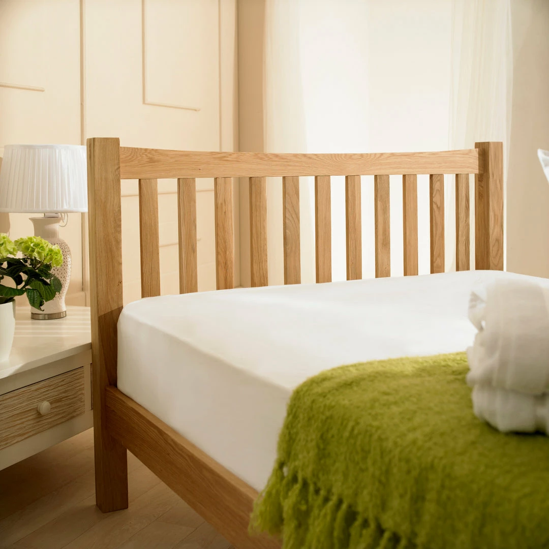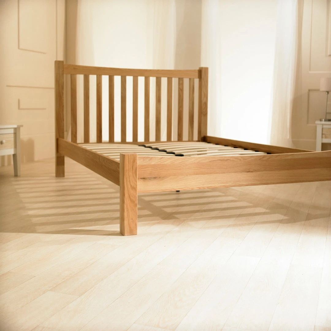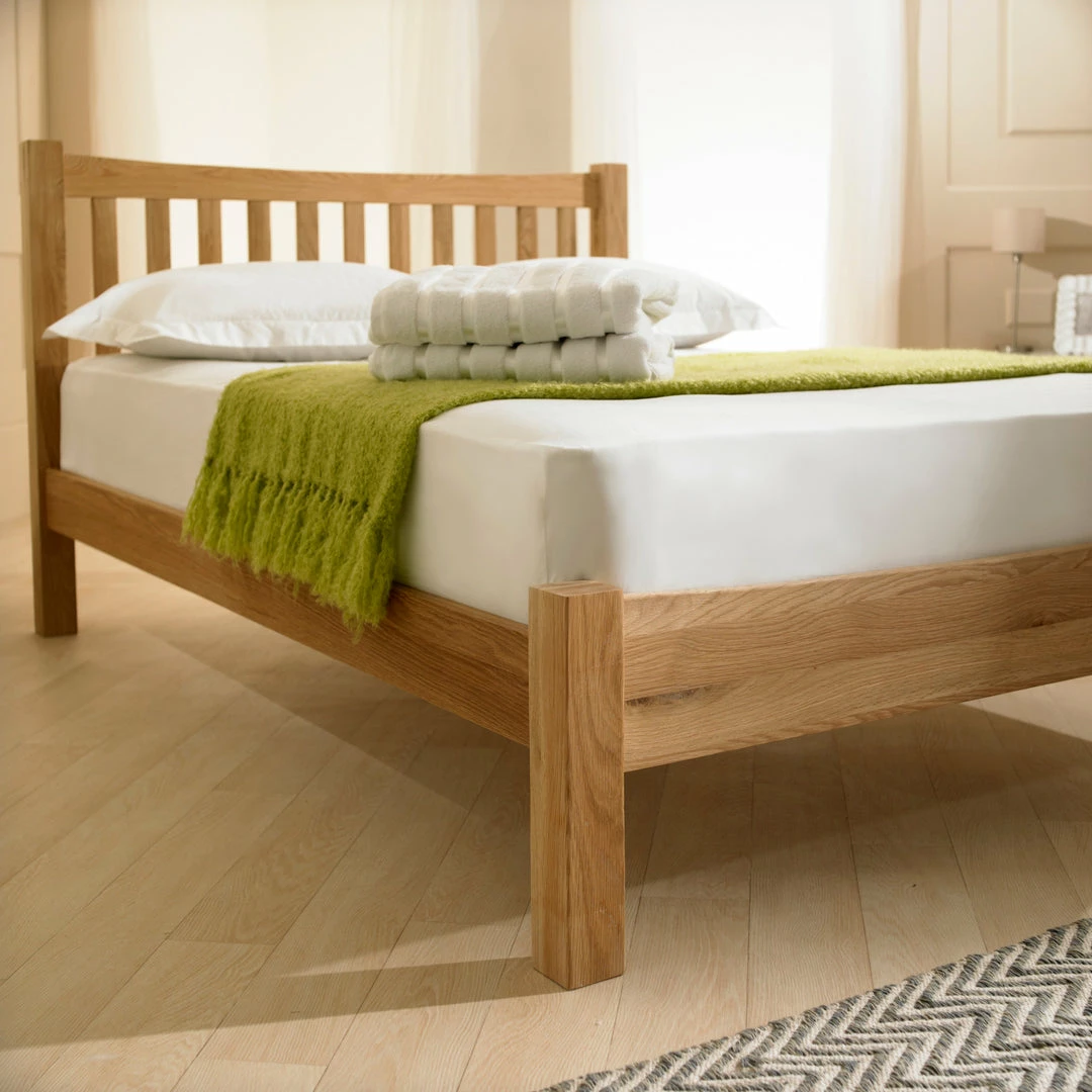 The stylish shaker bed frame that would add a contemporary item to the bedroom. Your gain would be solid oak giving advantages such as style. hard wearing, resistance against wear and tear and water resistance. The headboard with it’s slight curve adds a unique twist while the chunky posts gives you an indication that quality is apparent on this particular bed frame. With sprung slats that would work well with any mattress giving an ideal foundation.