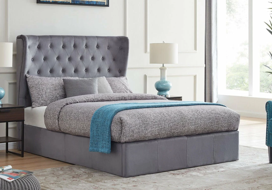 Sophisticated and modern this grey ottoman bed would bring storage and style to any bedroom. The grey upholstery fabric finish is neutral and contemporary working well with other fashionable furniture in the bedroom. With the headboard designed in a wing effect this beds going to bring a real statement to the area.Â