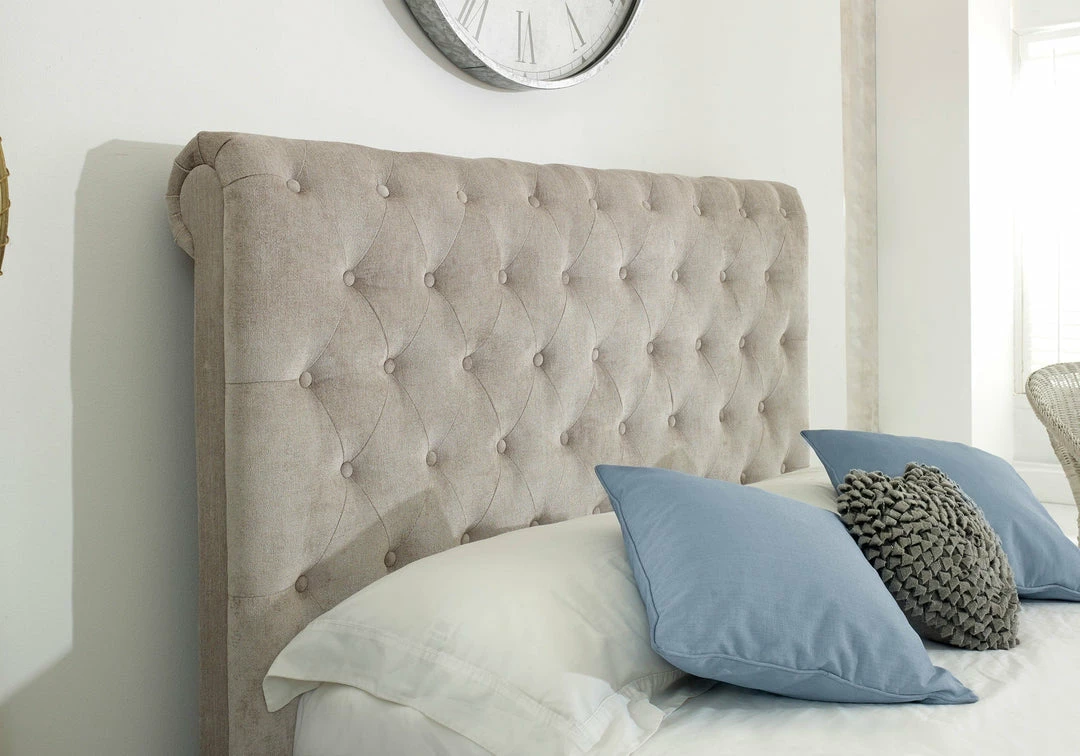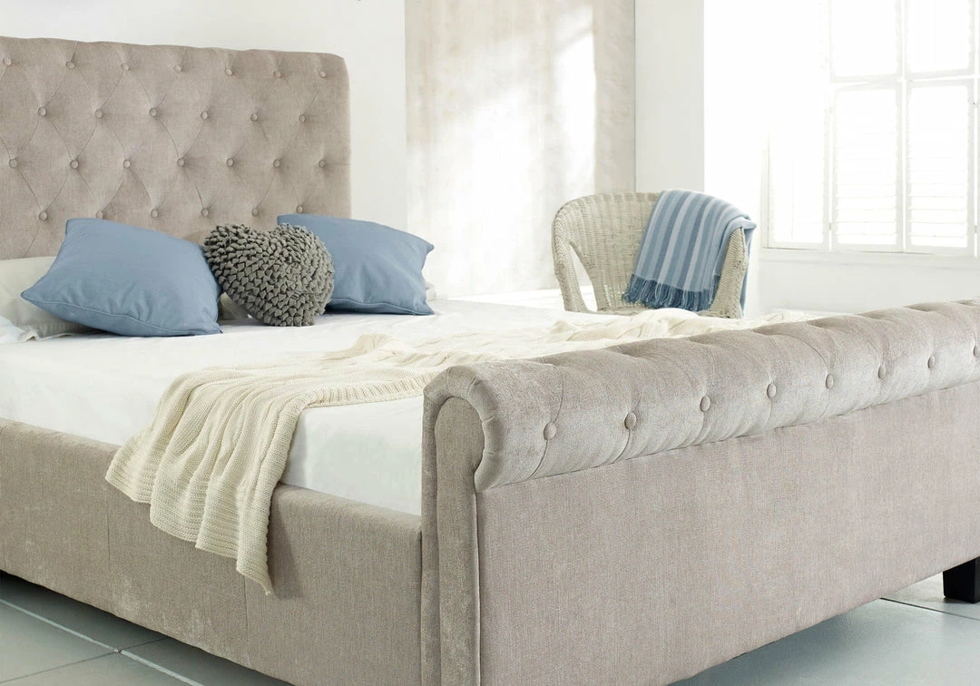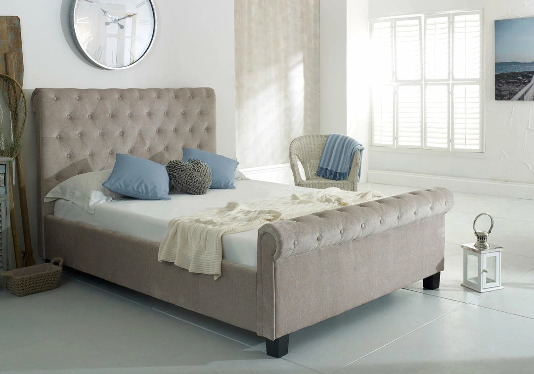 The roll top on this mink fabric bed would bring a grand feature to any bedroom. The colour is unique and would work well being a neutral shade being able to mix with original decor is one of it’s many advantages. The button style of the headboard and foot board never go’s out of fashion. The mattress fit’s in side the frame with a snug fit. the slight lift from the floor adds another dimension to it’s stylish features.Â