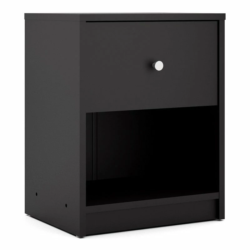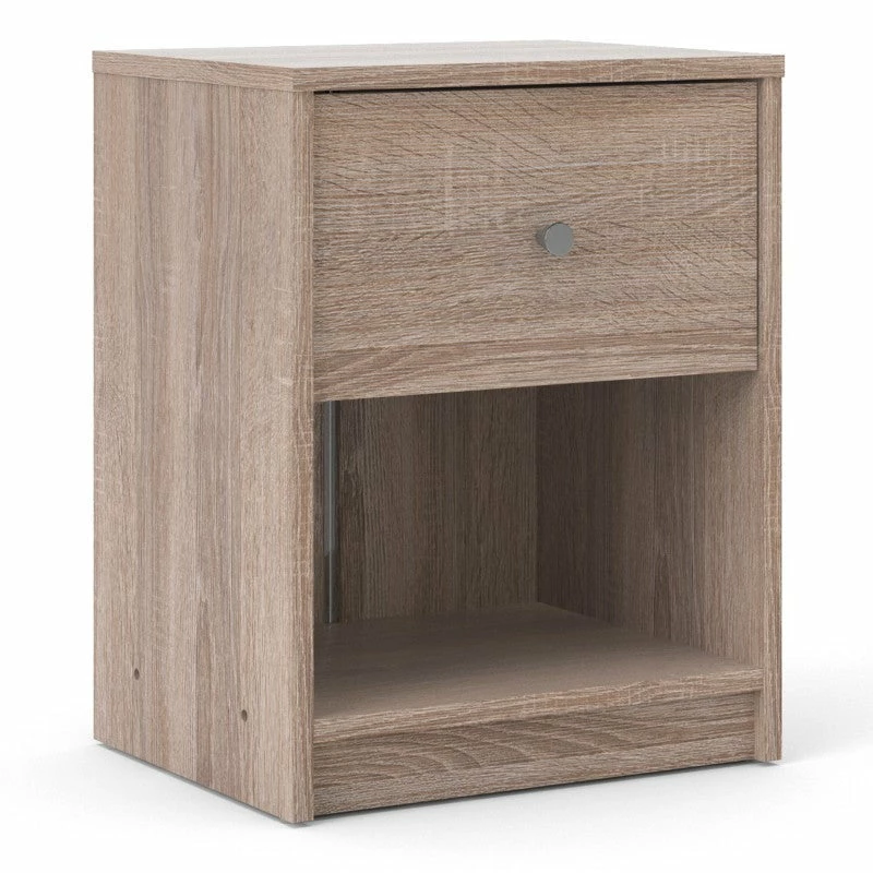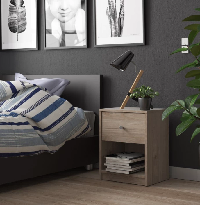 The Furniture To Go May Bedside 1 Drawer comes in colours such as white, truffle oak and Jackson hickory oak all work well with other shades. With the design your going to find the bedside strong and stable through the years. Finished with the silver handles opening and closing the bedside table is effortless.Â