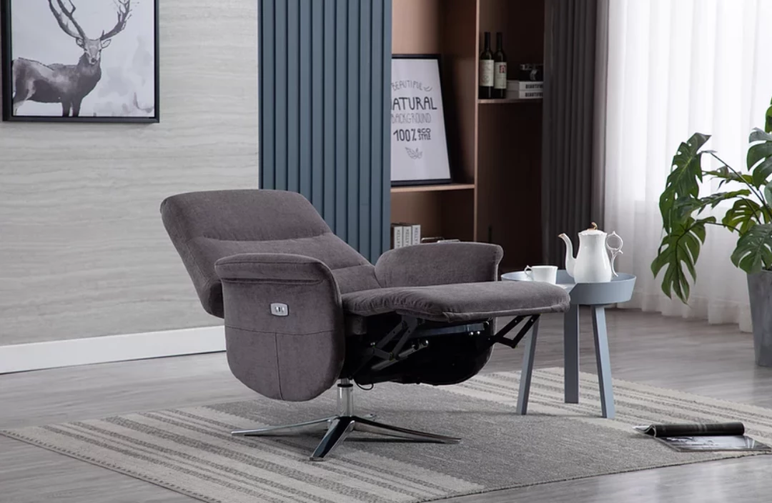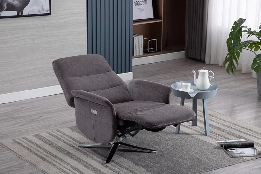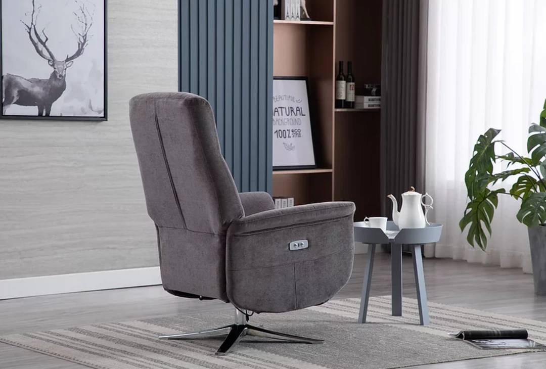 The grey fabric would mix well with other furniture in the space having neutral and modern virtues. The silver base keep the recliner sturdy and stable for a long term buy. Padded generously this brings comfort and keeps the user in a healthy position at all times.