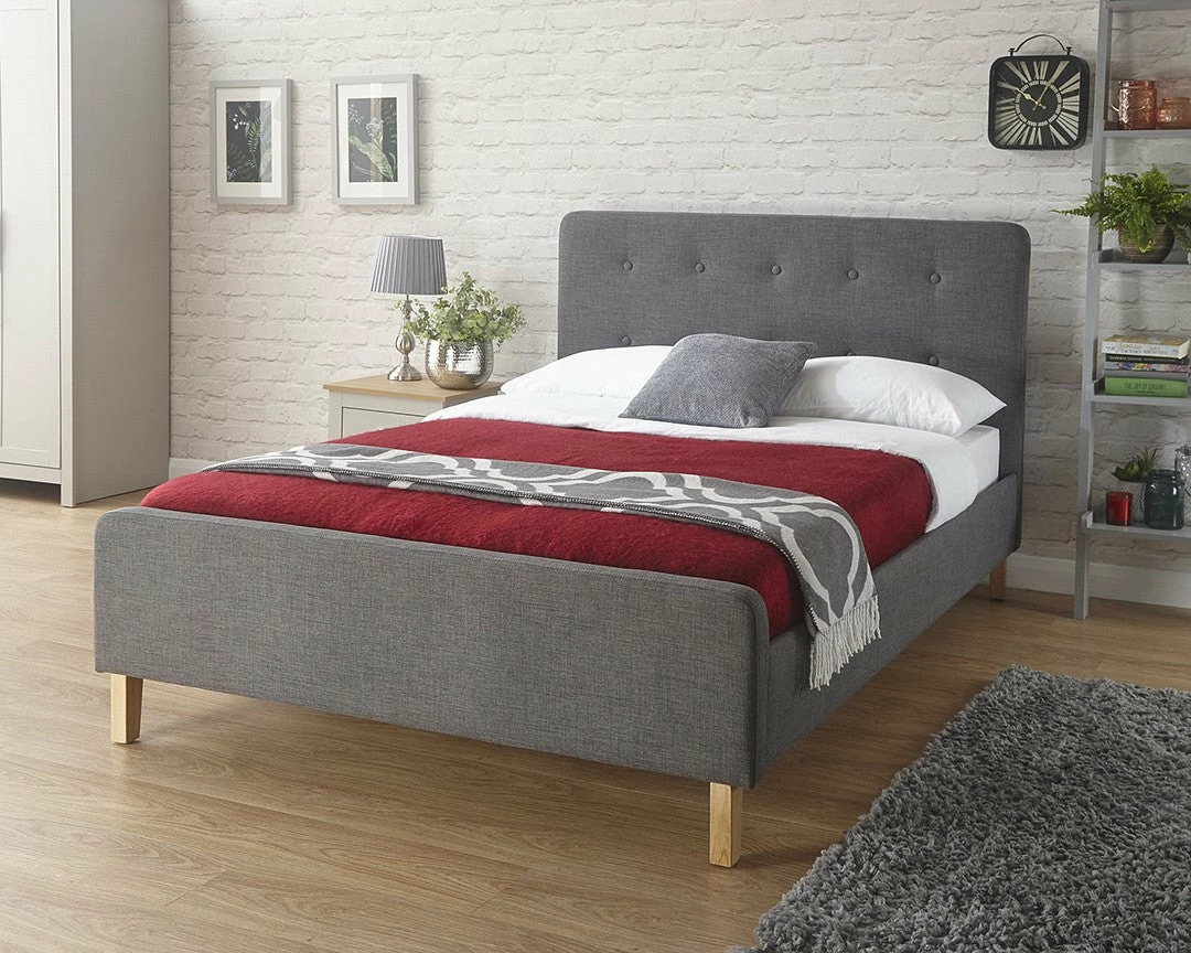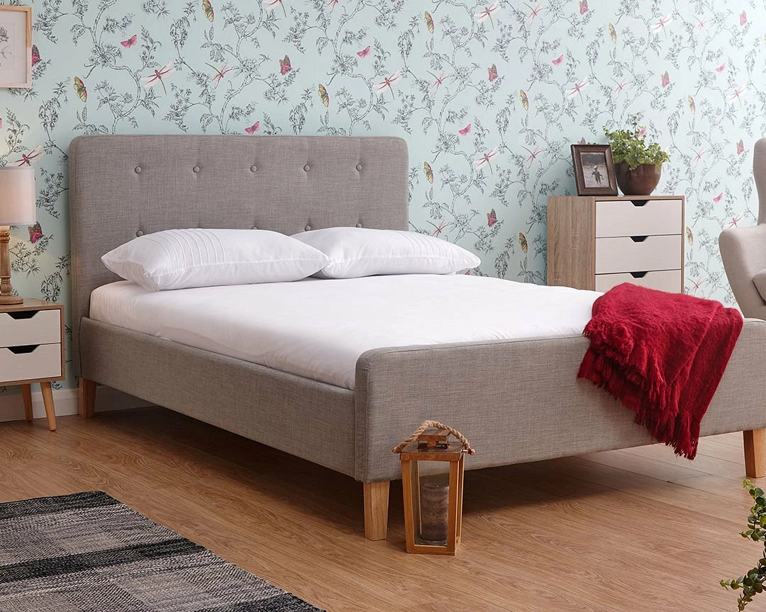 The GFW Ashbourne Bed has stylish feel with the button headboard not over powering but just right. The slight curve on the edges of the head and foot board adds character and charm. The wooden feet elevate the bed from the floor this creates light and also adds another colour and material to the bedroom.Â