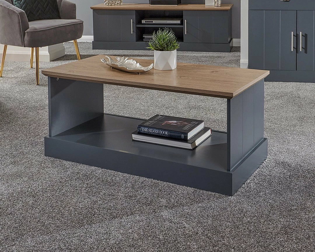 Smart and trendy this modern coffee table could be a quality edition to any stylish home. The grey or blue with an oak top finish is sophisticated and works well with other furniture in the space. The size is just right not too big and bulky to over power the room but ideal for storage and tea times.Â