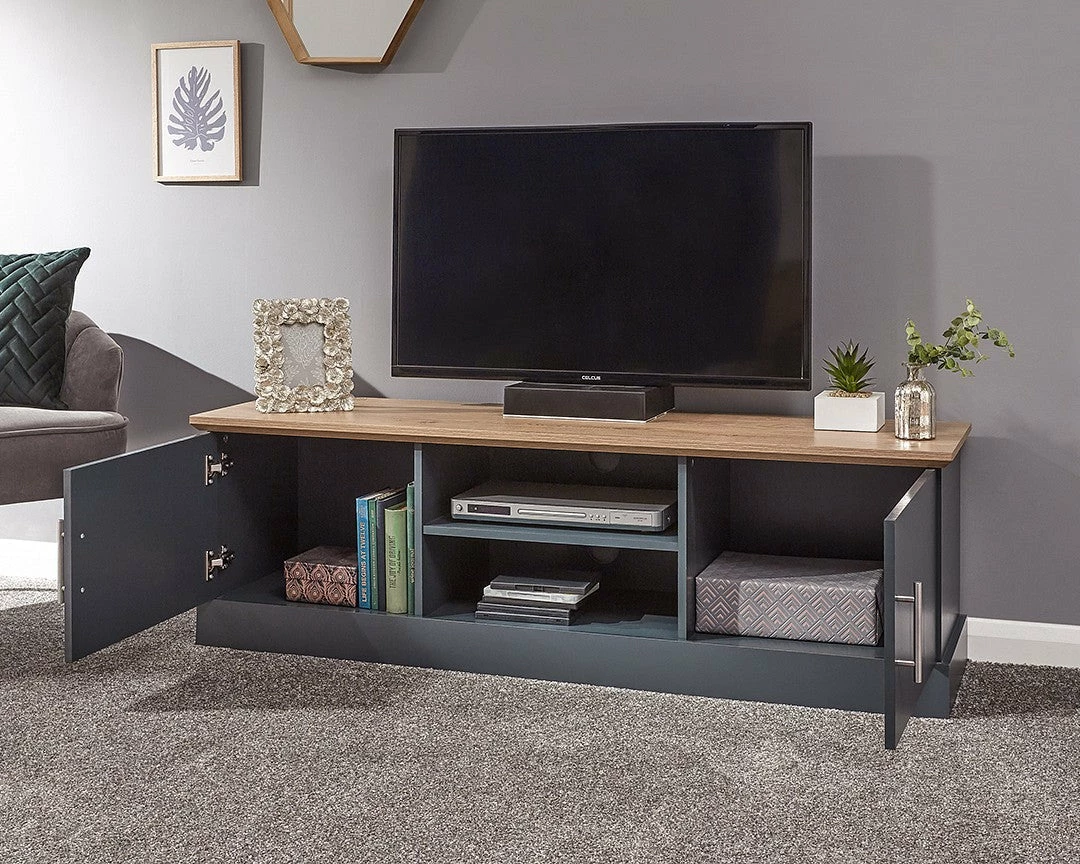 This modern large TV cabinet could be the reliable buy you’ve been searching for online. The straight lines bring a contemporary stamp to the unit while the colours blue, grey and oak are all neutral. The strong materials add a long lasting nature with reliable advantages.Â