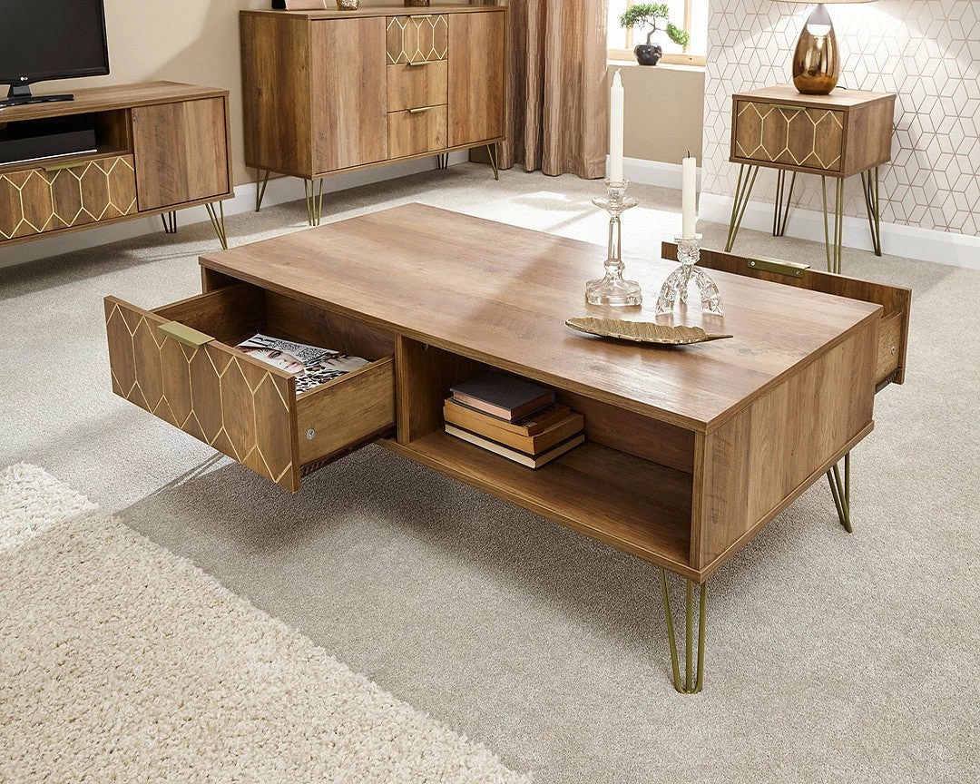 The GFW Orleans Coffee Table has strong feet with a golden colour this brings character to furniture item. The mango laminated finish is easily maintained just a quick dust down and wipe and your good to go. With the design being 2 sided this brings options being able to use from both ends of the coffee table means easy access. Â