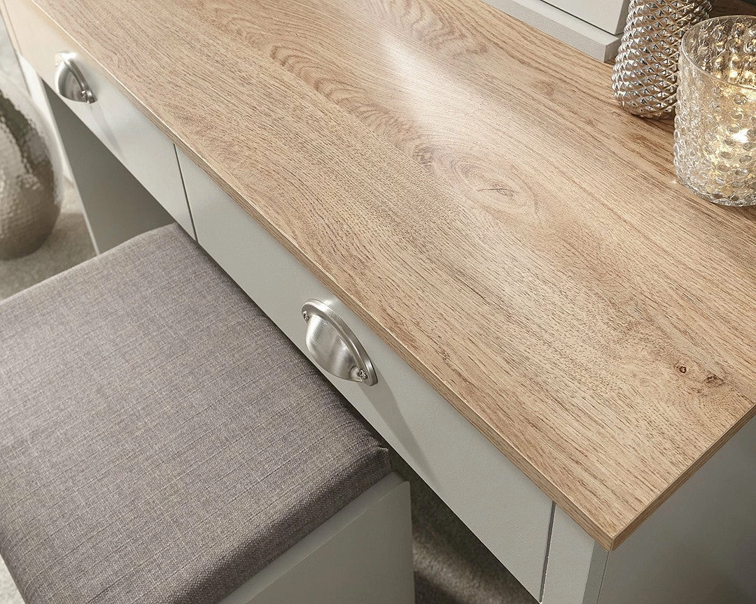 Elegant and sophistication are traits of this grey and oak effect dressing table and stool. Featuring storage for your easy access items. The stool has a upholstered fabric top with fillings inside to keep you comfortable.Â