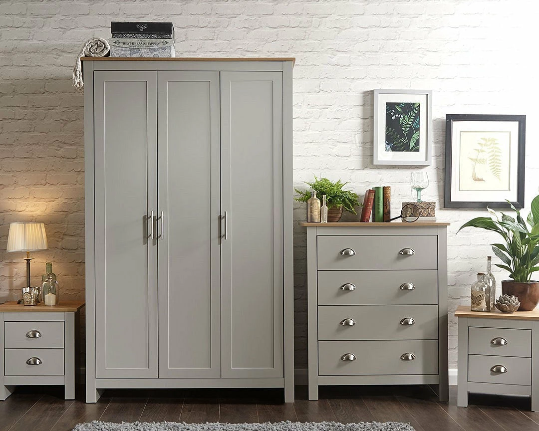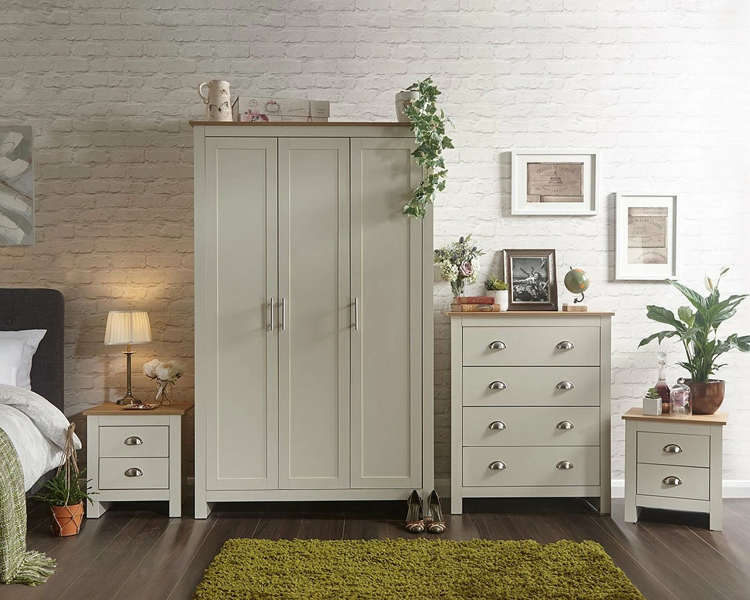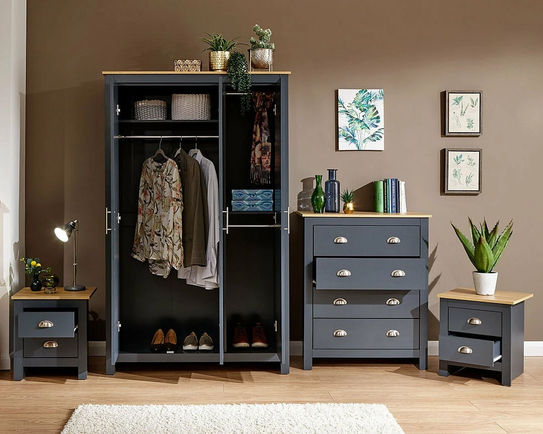 With the GFW Lancaster 4 Piece Bedroom Set coming in two tone the oak and colour helps when matching with other furniture. The dash of silver from the handles looks sophisticated and adds strength. With the metal runners and hinges adding life-span and reliable values to the buy. Coming as flat packed furniture it’s an easy journey to the room of choice on the delivery day.Â