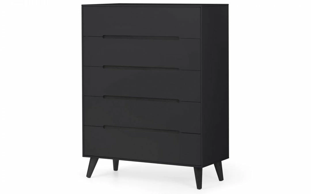 The Julian Bowen Alicia 5 Drawer Chest Anthracite is elevated from the floor with the Scandinavian styled legs for a strong and sturdy foundation. Use the recessed handles to open and close the drawers for a stylish and effortless effect. The size isn’t bulky or over powering but just right for a meaningful bedroom furniture product.Â