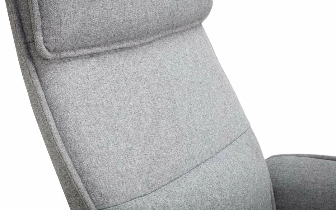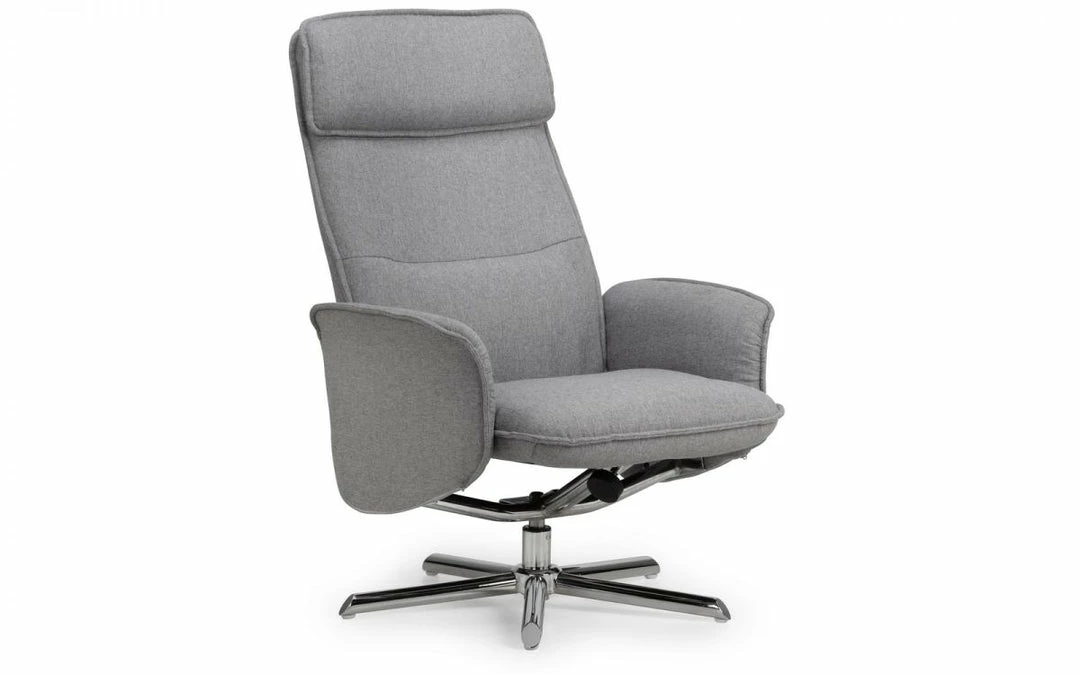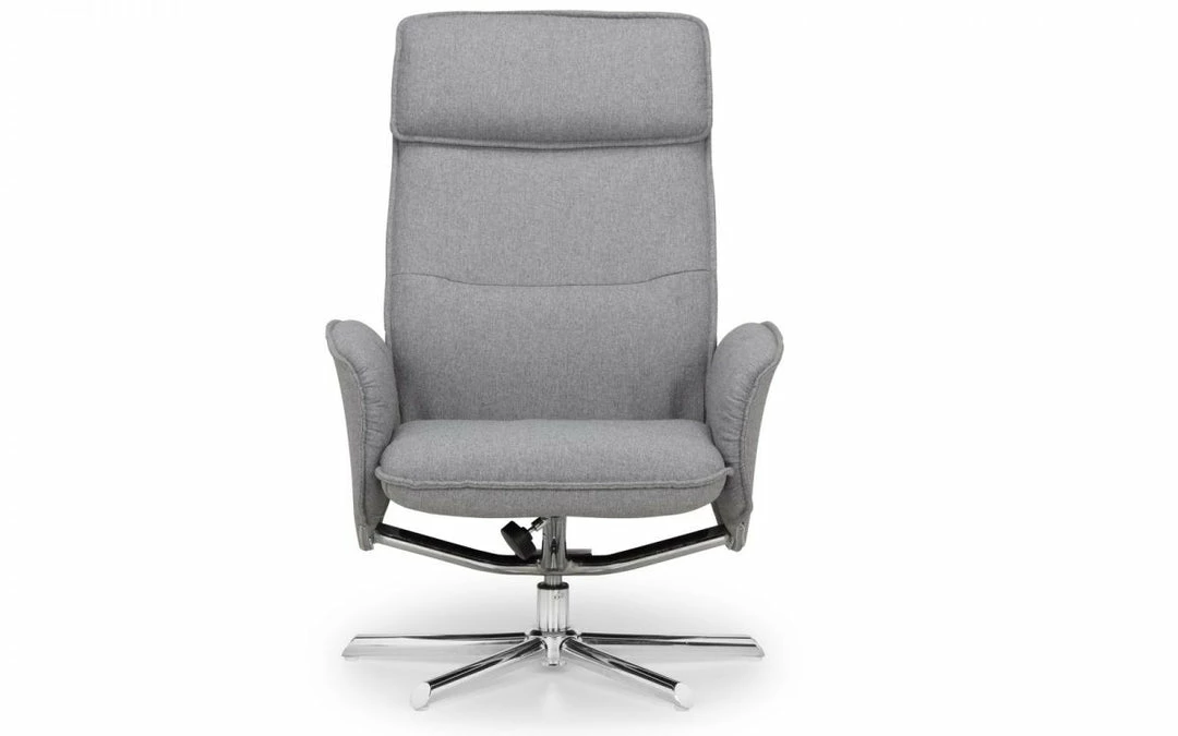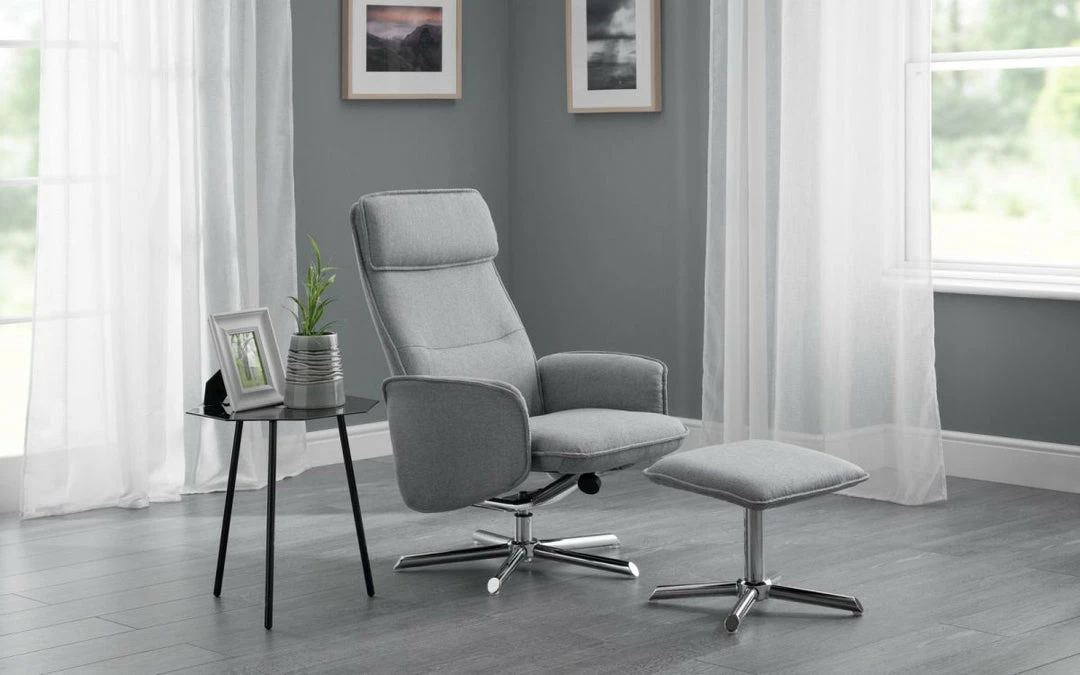 This grey recliner and stool would add an effective modern buy to the living area. The grey linen fabric upholstery is contemporary and complements other colours in the room. The comfortable padded seat and headrest just adds to the comfort while the strong metal base provides a quality foundation for the recliner.Â