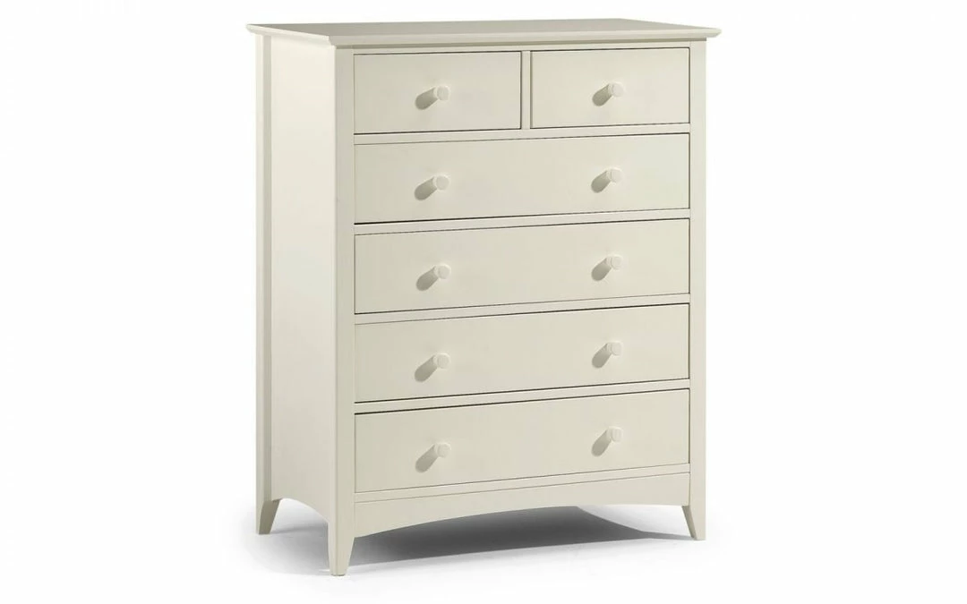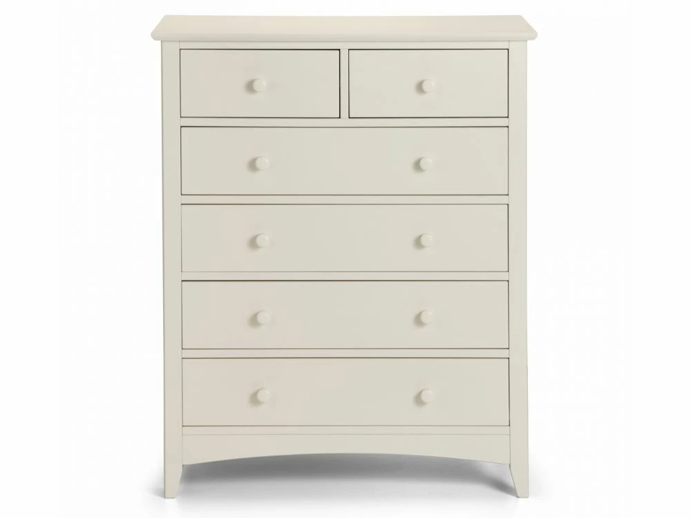 Cameo is a beautiful stone white lacquered bedroom range. Its timeless shaker design is the perfect accompaniment to any interior style and is perfect for grown-up bedrooms and children’s bedrooms alike. Solid pine frames ensure a sturdy and durable construction.The Cameo 4+2 chest offers a great storage solution with 2 small drawers and 4Â large drawers.