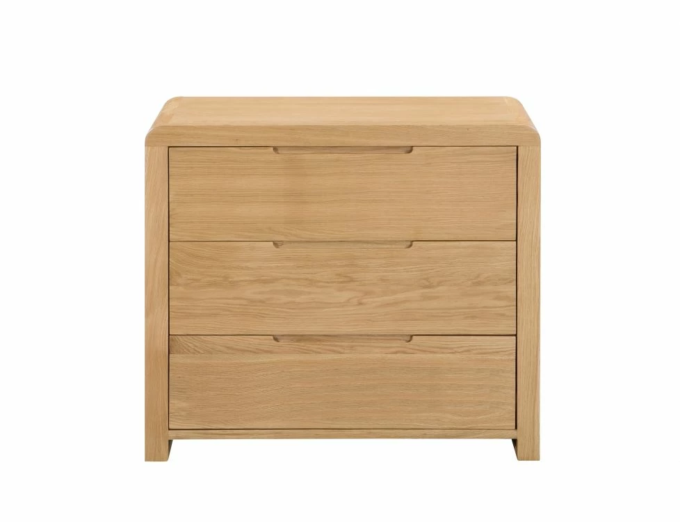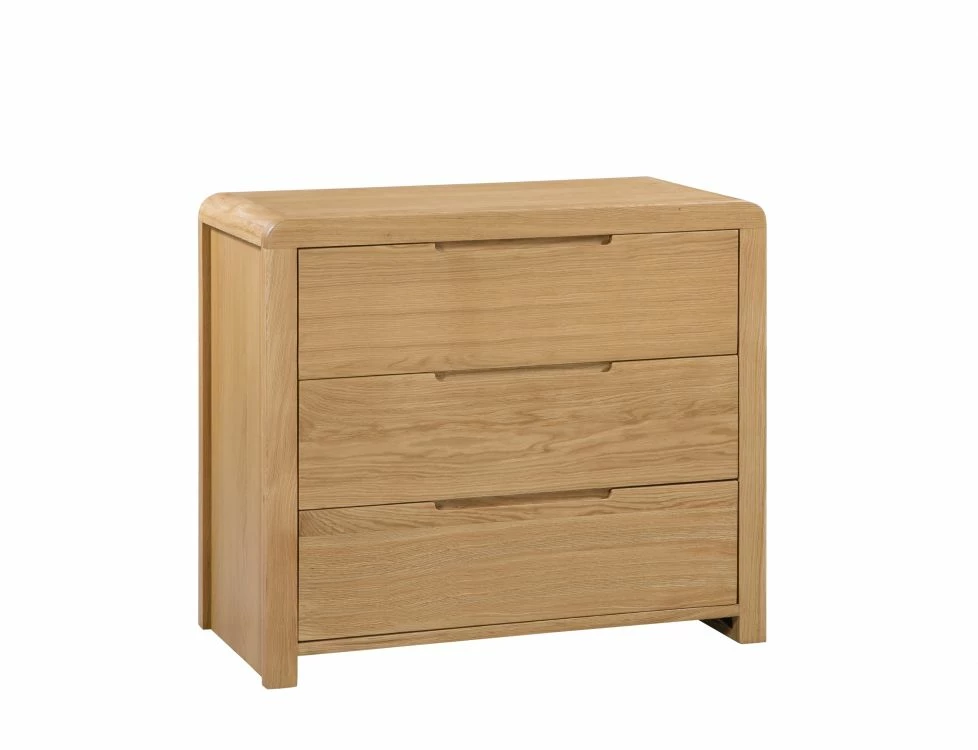 The Curve oak 3 draw chest of draws would add something different to your bedroom and home. The design has slight curves around the edges and straight lines for the draws. This solid oak piece has recessed handles to the draws that have delicately crafted with dove tail joints being a sign of a quality item of furniture. Your in for a treat with this one. Part of the curve Bedroom Furniture CollectionÂ