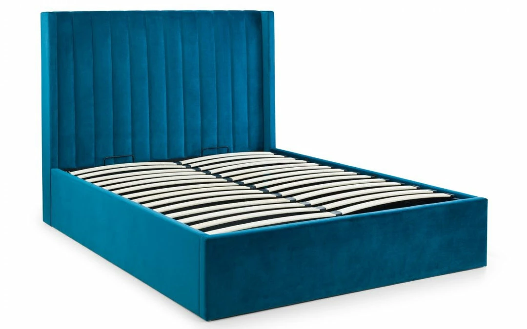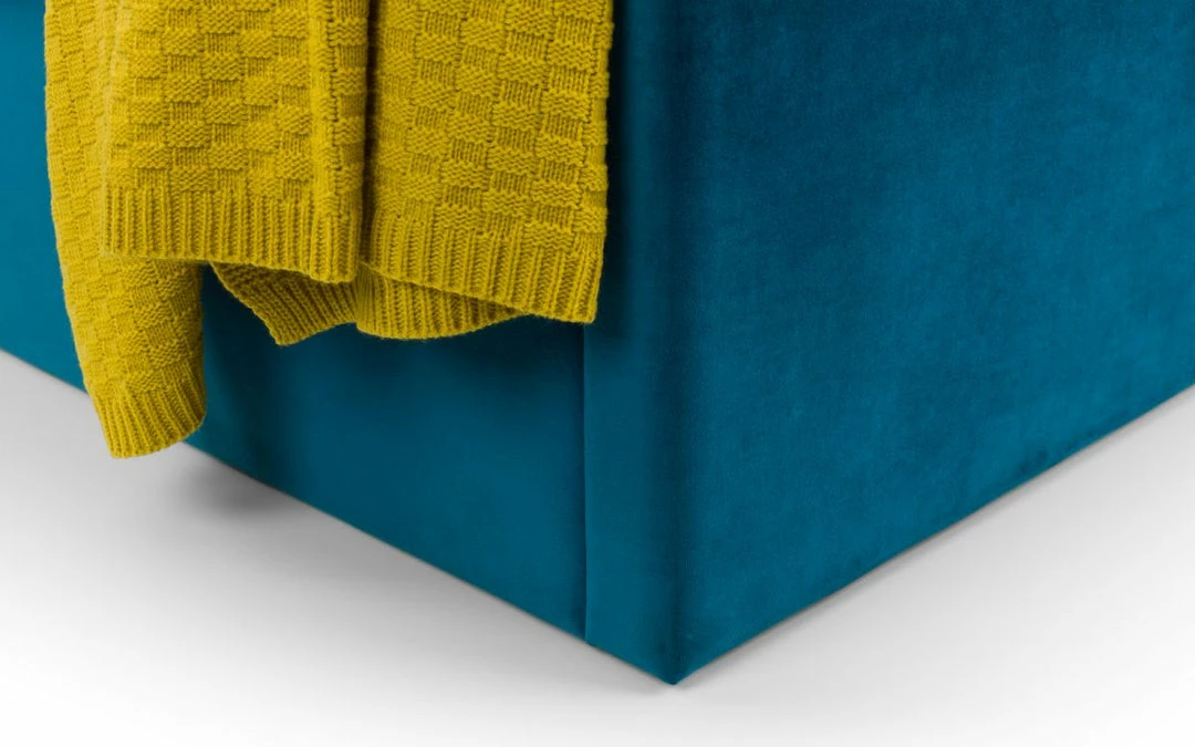 This teal ottoman bed has wooden frame underneath the upholstery that’s robust and strong. The mattress sits inside the frame providing a sturdy and solid sleeping surface for the users. With the bed sitting on the floor again this brings structurally sound values to the sleeping surface. The storage area is ideal for pillows, clothing and duvets providing easy access in the bedroom.Â
