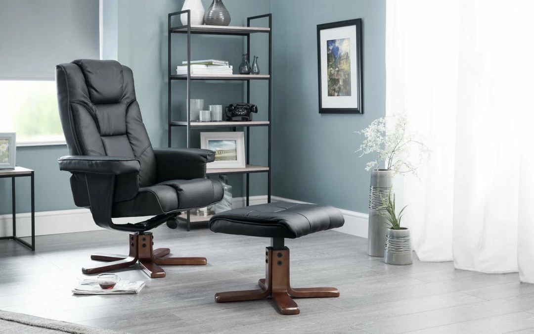 The Malmo recliner would bring a place to relax in the home on those lazy days. The faux leather in either black or brown is easily maintained and long lasting. The colours are easily matched with neutral values to both shades.Â