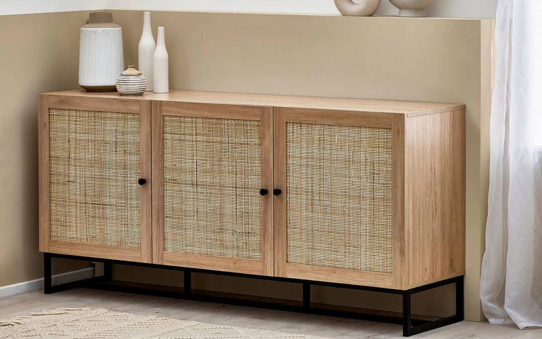 This smart sideboard could be effective in the home with cupboard doors for storage. Featuring the stylish rattan fronts ideal for making a modern statement in the chosen space. This charming sideboard is a large size just what you want for all your accessories to be placed with easy access in the space.Â