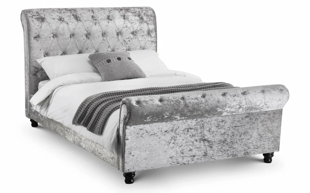 Verona is a striking sleigh bed presented in a sumptuous silver crushed velvet. It is a substantial bed characterised by exquisitely finished, luxurious upholstery and an imposing deep buttoned, high headboard with matching footboard. Verona adds a wow factor to any bedroom and is a perfect match for traditional and contemporary interiors alike. A sprung slatted base ensures extra comfort and prolonged mattress life.