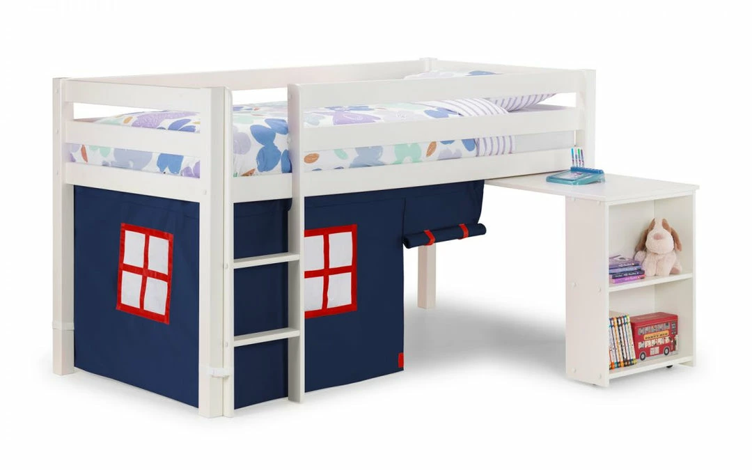 - Providing convenient storage for your kid’s inlcuding shelves, a pull out desk and a blue underbed play tent