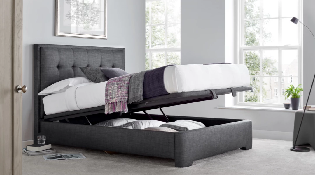 Charming and stylish this pendle slate ottoman bed will bring sophistication and class to the bedroom. The upholstered slate fabric finish is modern and would be an effective edition to any fashionable home. The contemporary button headboard is simplistic and well padded for a comfortable out come.Â