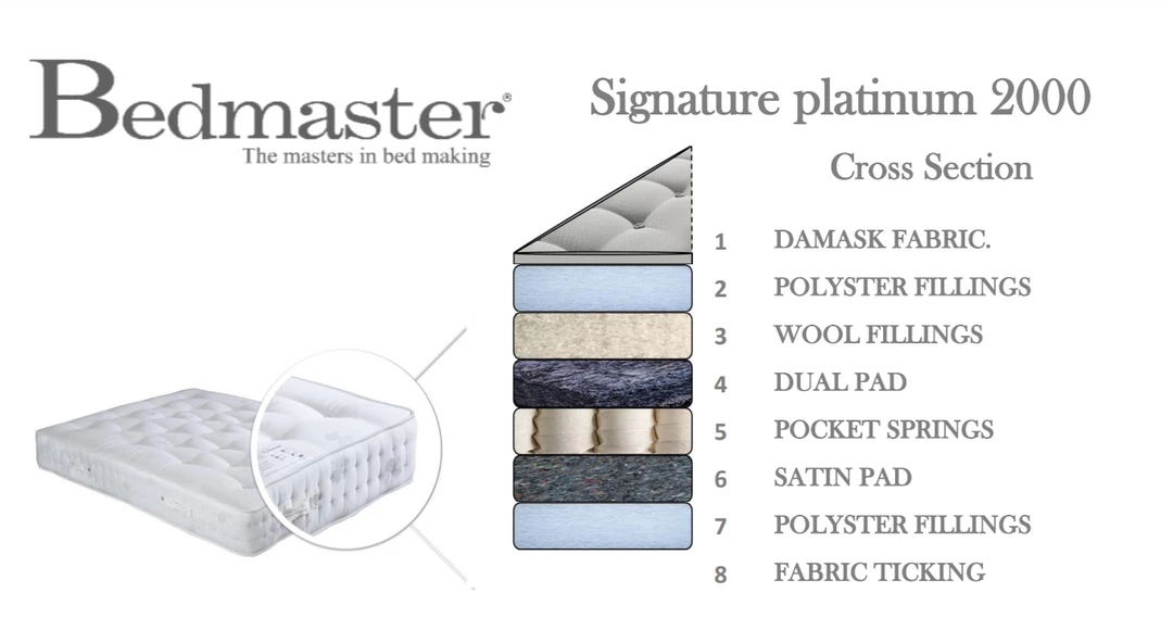 The signature 2000 Platinum Mattress has a pocket spring unit and is filled with wool and polyester for comfort. This mattress also has dual and satin pad to add extra support to the mattress. The model is hand tufted and has side stitching all added by the finest craftsmen.Â