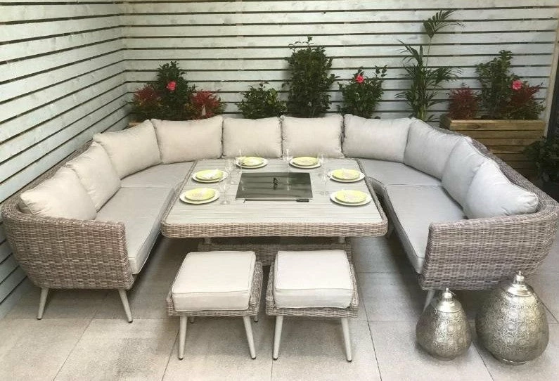 Unique and sophisticated this U shaped garden dining set has everything you need for the summer. The sofas, table and chairs along with the fire pit and drinks bucket make this set what it is. Ideal for entertaining with lot’s of space for everyone take the outdoor experience to another level today.Â